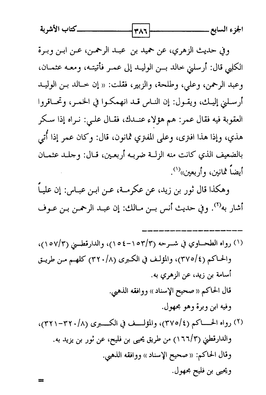 وفي حديث الزهري ، عن حميد بن عبد الرحمن ، عن ابن وبرة الكلبي قال : أرسلني خالد بن الوليد إلى عمر فأتيته ، ومعه عثمان ، وعبد الرحمن ، وعلي ، وطلحة ، والزبير ، فقلت : ( ( إن خالد بن الوليد أرسلني إليك ، ويقول : ( ( إن الناس قد انهمكوا في الخمر ، وتحاقروا العقوبة فيه فقال عمر : هم هؤلاء عندك ، فقال علي : نراه إذا سكر هذي ، وإذا هذا افترى ، وعلى المفترى ثمانون ، قال : وكان عمر إذا أتي بالضعيف الذي كانت منه الزلة ضربة أربعين ، قال : وجلد عثمان أيضاً ثمانين ، وأربعين ) ) ( 1 ) . وهكذا قال ثور بن زيد ، عن عكرمة ، عن ابن عباس : إن علياً أشار به ( 2 ) . وفي حديث أنس بن مالك : إن عبد الرحمن بن عوف