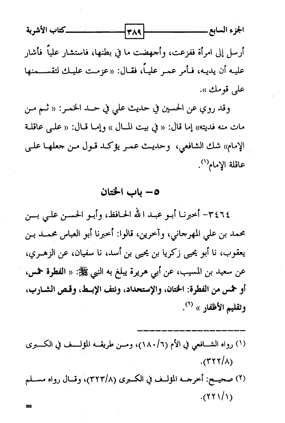 أرسل إلى امراة ففزعت ، وأجهضت ما في بطنها ، فاستشار علياً فأشار عليه أن يديه ، فأمر عمر علياً ، فقال : ( ( عزمت عليك لتقسمنها على قومك ) ) . وقد روي عن الحسين في حديث علي في حد الخمر : ( ( ثم من مات منه فديته ) ) إما قال : ( ( في بيت المال ) ) وإما قال : ( ( على عاقلة الإمام ) ) شك الشافعي ، وحديث عمر يؤكد قول من جعلها على عاقلة الإمام ( 1 ) . 5 - باب الختان
