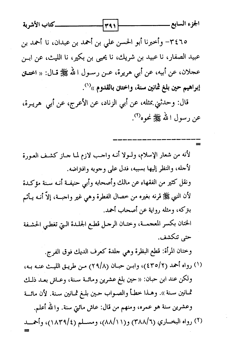3465 - وأخبرنا أبو الحسن علي بن أحمد بن عبدان ، نا أحمد بن عبيد الصفار ، نا عبيد بن شريك ، نا يحيى بن بكير ، نا الليث ، عن ابن عجلان ، عن أبيه ، عن أبي هريرة ، عن رسول الله صلى الله عليه وسلم قال : ( ( اختتن إبراهيم حين بلغ ثمانين سنة ، واختتن بالقدوم ) ) ( 1 ) . قال : وحدثني بمثله ، عن أبي الزناد ، عن الأعرج ، عن أبي هريرة ، عن رسول الله صلى الله عليه وسلم نحوه ( 2 ) .