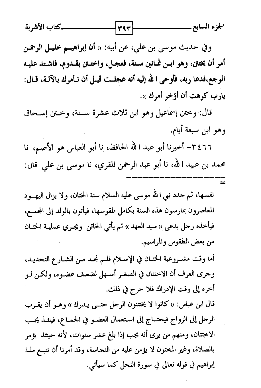 وفي حديث موسى بن علي ، عن أبيه : ( ( أن إبراهيم خليل الرحمن أمر أن يختتن ، وهو ابن ثمانين سنة ، فعجل ، واختتن بقدوم ، فاشتد عليه الوجع ، فدعا ربه ، فأوحى الله إليه أنه عجلت قبل أن نأمرك بالآلة ، قال : يا رب كرهت أن أؤخر أمرك ) ) . قال : وختن إسماعيل وهو ابن ثلاث عشرة سنة ، وختن إسحاق وهو ابن سبعة أيام .