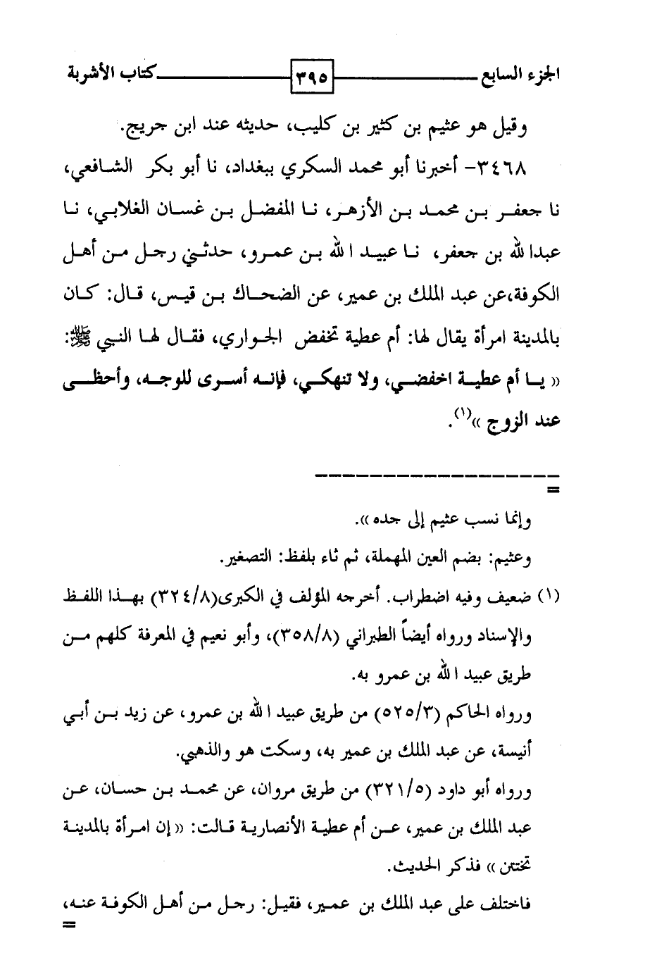 3468 - أخبرنا أبو محمد السكري ببغداد ، نا أبو بكر الشافعي ، نا جعفر بن محمد بن الأزهر ، نا المفضل بن غسان الغلابي ، نا عبد الله بن جعفر ، نا عبيد الله بن عمرو ، حدثني رجل من أهل الكوفة ، عن عبد الملك بن عمير ، عن الضحاك بن قيس ، قال : كان بالمدينة امرأة يقال لها : أم عطية تخفض الجواري ، فقال لها النبي صلى الله عليه وسلم ( ( يا أم عطية اخفضي ، ولا تنهكي ، فإنه أسرى للوجه ، وأحظى عند الزوج ) ) ( 1 ) .
