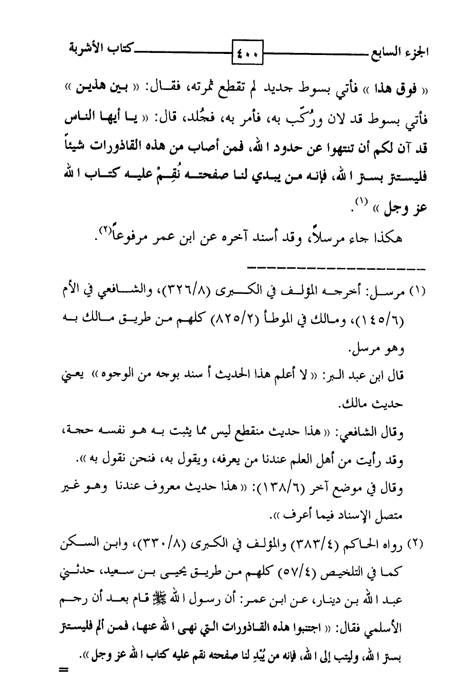( ( فوق هذا ) ) فأتي بسوط جديد لم تقطع ثمرته ، فقال : ( ( بين هذين ) ) فأتي بسوط قد لأن وركب به ، فأمر به ، فجلد ، قال : ( ( يا أيها الناس قد آن لكم أن تنتهوا عن حدود الله ، فمن أصاب من هذه القاذورات شيئاً فليستتر بستر الله ، فإنه من يبدي لنا صفحته نقم عليه كتاب الله عز وجل ) ) ( 1 ) . هكذا جاء مرسلاً ، وقد أسند آخره عن ابن عمر مرفوعاً ( 2 ) .