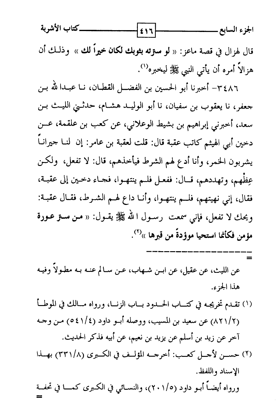 3486 - أخبرنا أبو الحسين بن الفضل القطان ، نا عبد الله بن جعفر ، نا يعقوب بن سفيان ، نا أبو الوليد هشام ، حدثني الليث بن سعد ، أخبرني إبراهيم بن بشيط الوعلاني ، عن كعب بن علقمة ، عن دخين أبي الهيثم كاتب عقبة قال : قلت لعقبة بن عامر : إن لنا جيراناً يشربون الخمر ، وأنا أدع لهم الشرط فيأخذهم ، قال : لا تفعل ، ولكن عظهم ، وتهددهم ، قال : ففعل فلم ينتهوا ، فجاء دخين إلى عقبة ، فقال ، إني نهيتهم ، فلم ينتهوا ، وأنا داع لهم الشرط ، فقال عقبة : ويحك لا تفعل ، فإني سمعت رسول الله صلى الله عليه وسلم يقول : ( ( من ستر عورة مؤمن فكأنما استحيا موؤدة من قبرها ) ) ( 2 ) .