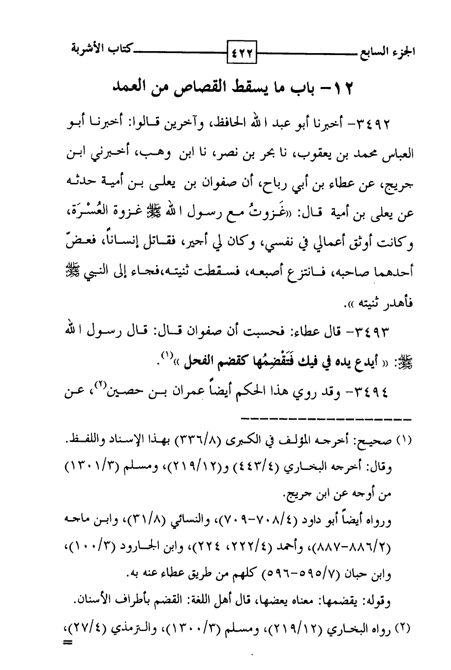 3492 - أخبرنا أبو عبد الله الحافظ ، وآخرين قالوا : أخبرنا أبو العباس محمد بن يعقوب ، نا بحر بن نصر ، نا ابن وهب ، أخبرني ابن جريج ، عن عطاء بن أبي رباح ، أن صفوان بن يعلى بن أمية حدثه عن يعلى بن أمية قال : ( ( غزوت مع رسول الله صلى الله عليه وسلم غزوة العسرة ، وكانت أوثق أعمالي في نفسي ، وكان لي أجير ، فقاتل إنساناً ، فعض أحدهما صاحبه ، فانتزع أصبعه ، فسقطت ثنيته ، فجاء إلى النبي صلى الله عليه وسلم فأهدر ثنيته ) ) .