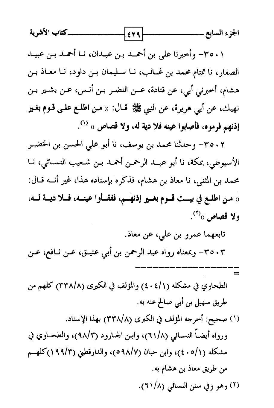 3501 - وأخبرنا على بن أحمد بن عبدان ، نا أحمد بن عبيد الصفار ، نا تمتام محمد بن غالب ، نا سليمان بن داود ، نا معاذ بن هشام ، أخبرني أبي ، عن قتادة ، عن النضر بن أنس ، عن بشير بن نهيك ، عن أبي هريرة ، عن النبي صلى الله عليه وسلم قال : ( ( من اطلع على قوم بغير إذنهم فرموه ، فأصابوا عينه فلا دية له ، ولا قصاص ) ) ( 1 ) .