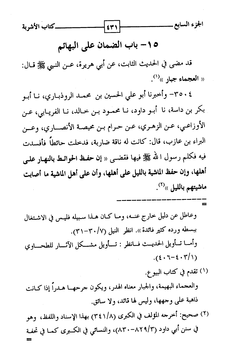 3504 - وأخبرنا أبو علي الحسين بن محمد الروذباري ، نا أبو بكر بن داسة ، نا أبو داود ، نا محمود بن خالد ، نا الفريابي ، عن الأوزاعي ، عن الزهري ، عن حرام بن محيصة الأنصاري ، وعن البراء بن عازب ، قال : كانت له ناقة ضاربة ، فدخلت حائطاً فأفسدت فيه فكلم رسول الله صلى الله عليه وسلم فيها فقضى ( ( إن حفظ الحوائط بالنهار على أهلها ، وإن حفظ الماشية بالليل على أهلها ، وأن على أهل الماشية ما أصابت ماشيتهم بالليل ) ) ( 2 ) .