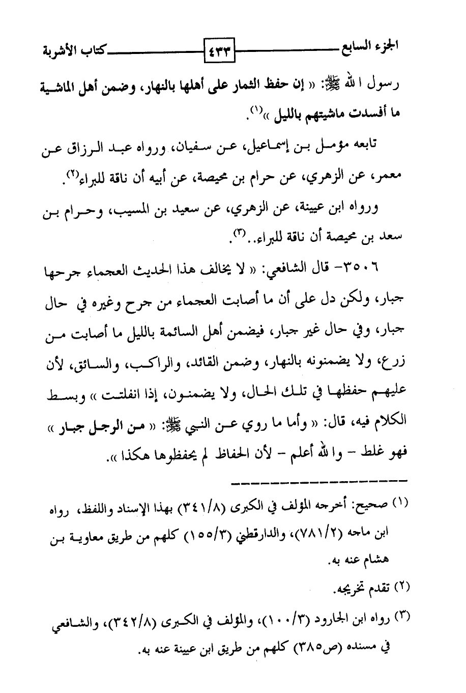 رسول الله صلى الله عليه وسلم : ( ( إن حفظ الثمار على أهلها بالنهار ، وضمن أهل الماشية ما أفسدت ماشيتهم بالليل ) ) ( 1 ) . تابعه مؤمل بن إسماعيل ، عن سفيان ، ورواه عبد الرزاق عن معمر ، عن الزهري ، عن حرام بن محيصة ، عن أبيه أن ناقة للبراء ( 2 ) . ورواه ابن عيينة ، عن الزهري ، عن سعيد بن المسيب ، وحرام بن سعد بن محيصة أن ناقة للبراء . . . ( 3 ) .