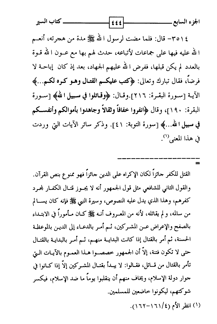 3514 - قال : فلما مضت لرسول الله صلى الله عليه وسلم مدة من هجرته ، أنعم الله عليه فيها على جماعات لأتباعه ، حدث لهم بها مع عون الله قوة بالعدد لم يكن قبلها ، ففرض الله عليهم الجهاد ، بعد إذ كان إباحة لا فرضاً ، فقال تبارك تعالى : ! ( كتب عليكم القتال وهو كره لكم ) ! الآية [ سورة البقرة : 216 ] . وقال : ! ( وقاتلوا في سبيل الله ) ! [ سورة البقرة : 190 ] ، وقال ( انفروا خفاقاً وثقالاً وجاهدوا بأموالكم وأنفسكم في سبيل الله . . . . . . ) [ سورة التوبة : 41 ] . وذكر سائر الآيات التي وردت في هذا المعنى ( 1 ) .