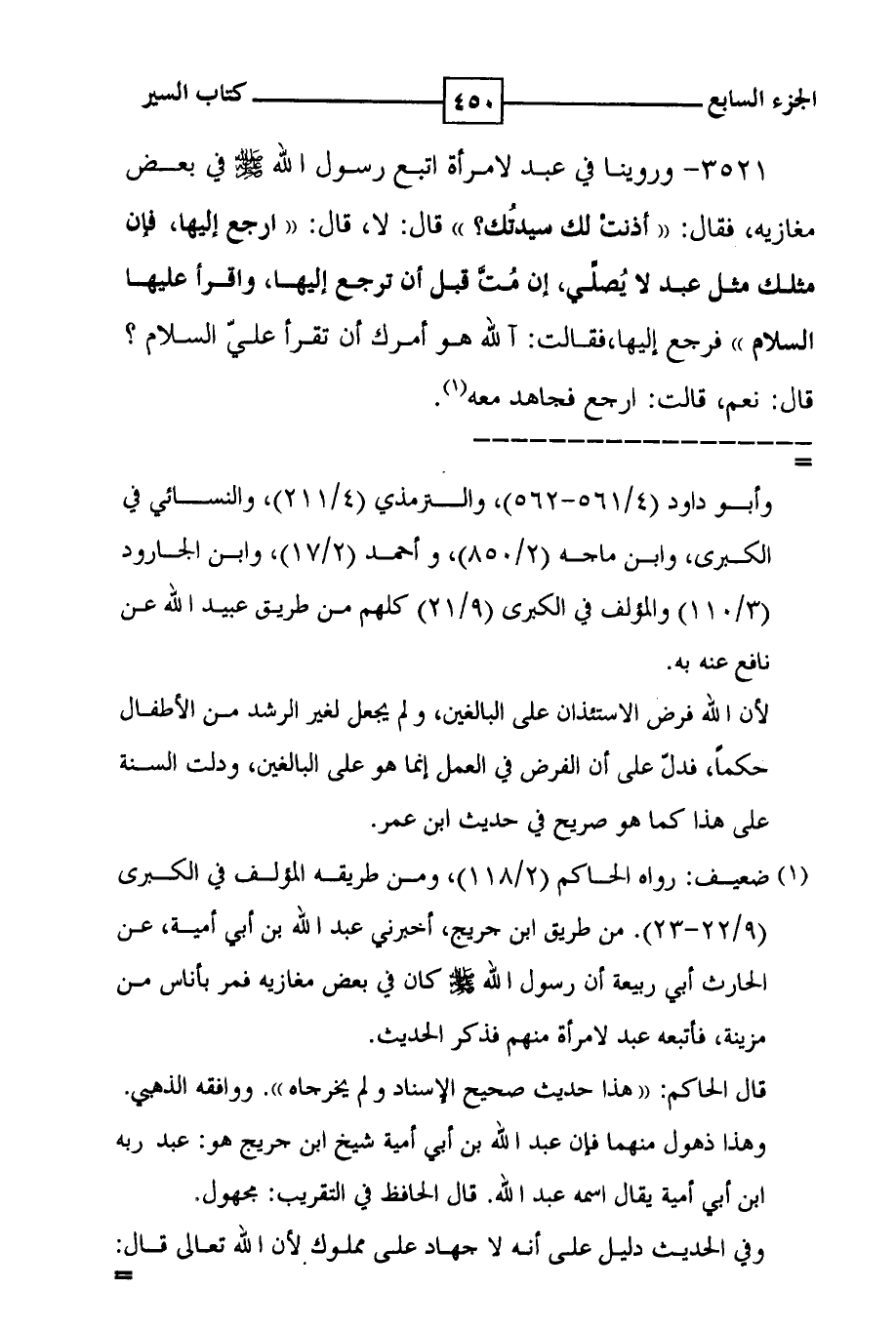 3521 - وروينا في عبد لامرأة اتبع رسول الله صلى الله عليه وسلم في بعض مغازيه ، فقال : ( ( أذنت لك سيدتك ؟ ) ) قال : لا ، قال : ( ( ارجع إليها ، فإن مثلك مثل عبد لا يصلي ، إن مت قبل أن ترجع إليها ، واقرأ عليها السلام ) ) فرجع إليها ، فقالت : الله هو أمرك أن تقرأ علي السلام ؟ قال : نعم ، قالت : ارجع فجاهد معه ( 1 ) .