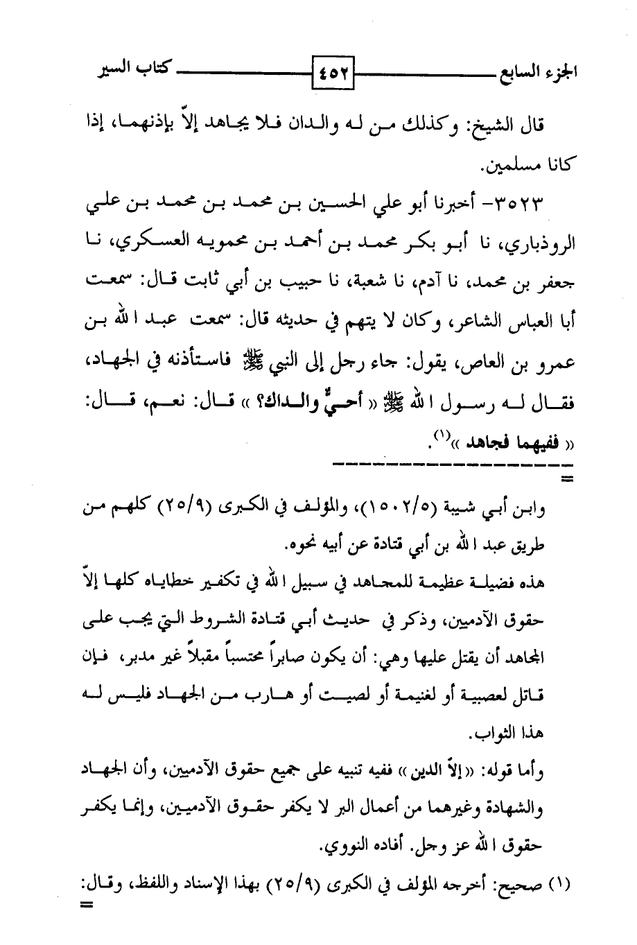 3523 - أخبرنا أبو علي الحسين بن محمد بن علي الروذباري ، نا أبو بكر محمد بن أحمد بن محمويه العسكري ، نا جعفر بن محمد ، نا آدم ، نا شعبة ، نا حبيب بن أبي ثابت قال : سمعت أبا العباس الشاعر ، وكان لا يتهم في حديثه قال : سمعت عبد الله بن عمرو بن العاص ، يقول : جاء رجل إلى النبي صلى الله عليه وسلم : ( ( فاستأذنه في الجهاد ، فقال له رسول الله صلى الله عليه وسلم ( ( أحي والداك ؟ ) ) قال : نعم ، قال : ( ( ففيهما فجاهد ) ) ( 1 ) .