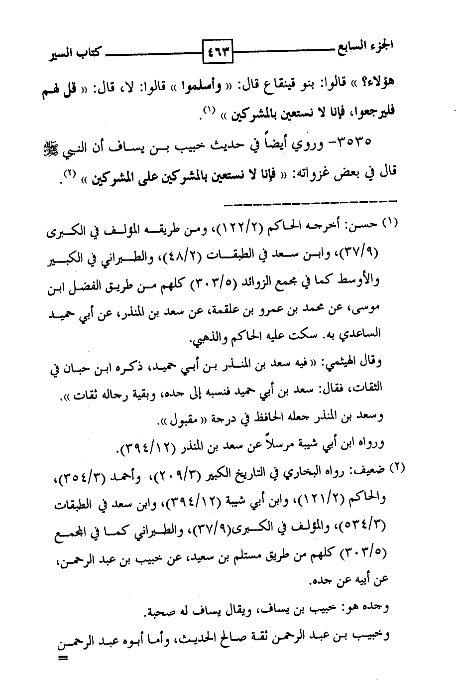 3535 - وروي أيضاً في حديث خبيب بن يساف أن النبي صلى الله عليه وسلم قال في بعض غزواته : ( ( فإنا لا نستعين بالمشركين على المشركين ) ) ( 2 ) .