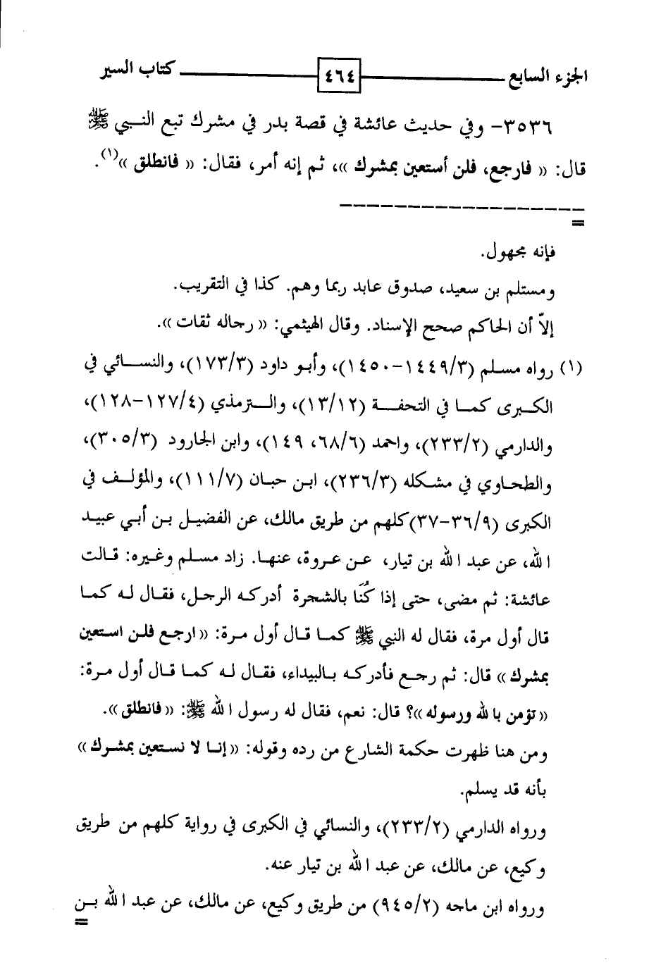 3536 - وفي حديث عائشة في قصة بدر في مشرك تبع النبي صلى الله عليه وسلم قال : ( ( فارجع ، فلن أستعين بمشرك ) ) ، ثم إنه أمر ، فقال : ( ( فانطلق ) ) ( 1 ) .