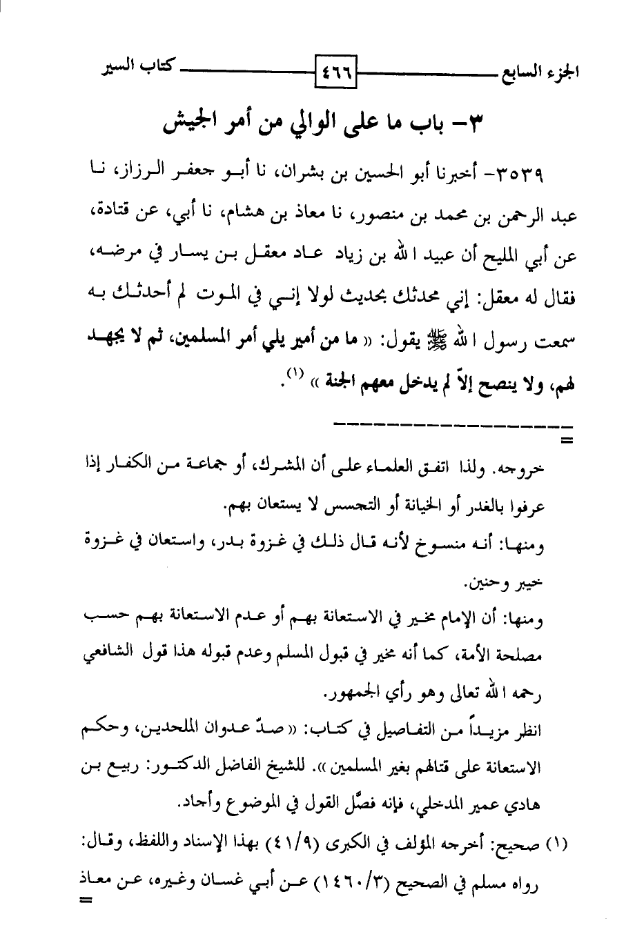 3539 - أخبرنا أبو الحسين بن بشران ، نا أبو جعفر الرزاز ، نا عبد الرحمن بن محمد بن منصور ، نا معاذ بن هشام ، نا أبي ، عن قتادة ، عن أبي المليح أن عبيد الله بن زياد عاد معقل بن يسار في مرضه ، فقال له معقل : إني محدثك بحديث لولا إني في الموت أم أحدثك به سمعت رسول الله صلى الله عليه وسلم يقول : ( ( ما من أمير يلي أمر المسلمين ، ثم لا يجهد لهم ، ولا ينصح إلا لم يدخل معهم الجنة ) ) ( 1 ) .
