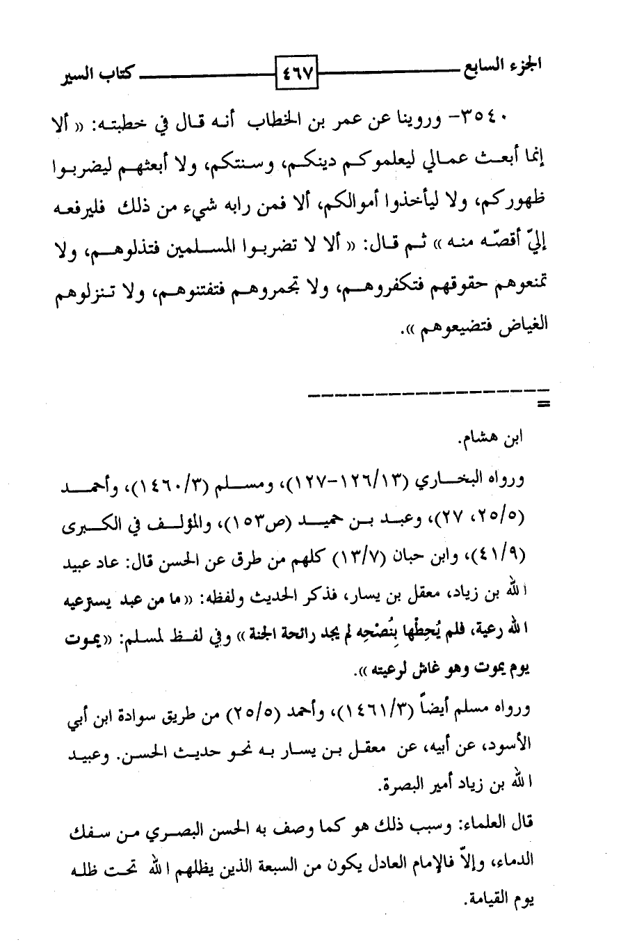 3540 - وروينا عن عمر بن الخطاب أنه قال في خطبته : ( ( ألا إنما أبعث عمالي ليعلموكم دينكم ، وسنتكم ، ولا أبعثهم ليضربوا ظهوركم ، ولا ليأخذوا أموالكم ، ألا فمن رابه شيء من ذلك فليرفعه إلي أقصه منه ) ) ثم قال : ( ( ألا لا تضربوا المسلمين فتذلوهم ، ولا تمنعوهم حقوقهم فتكفروهم ، ولا تجمروهم فتفتنوهم ، ولا تنزلوهم الغياض فتضيعوهم ) ) .