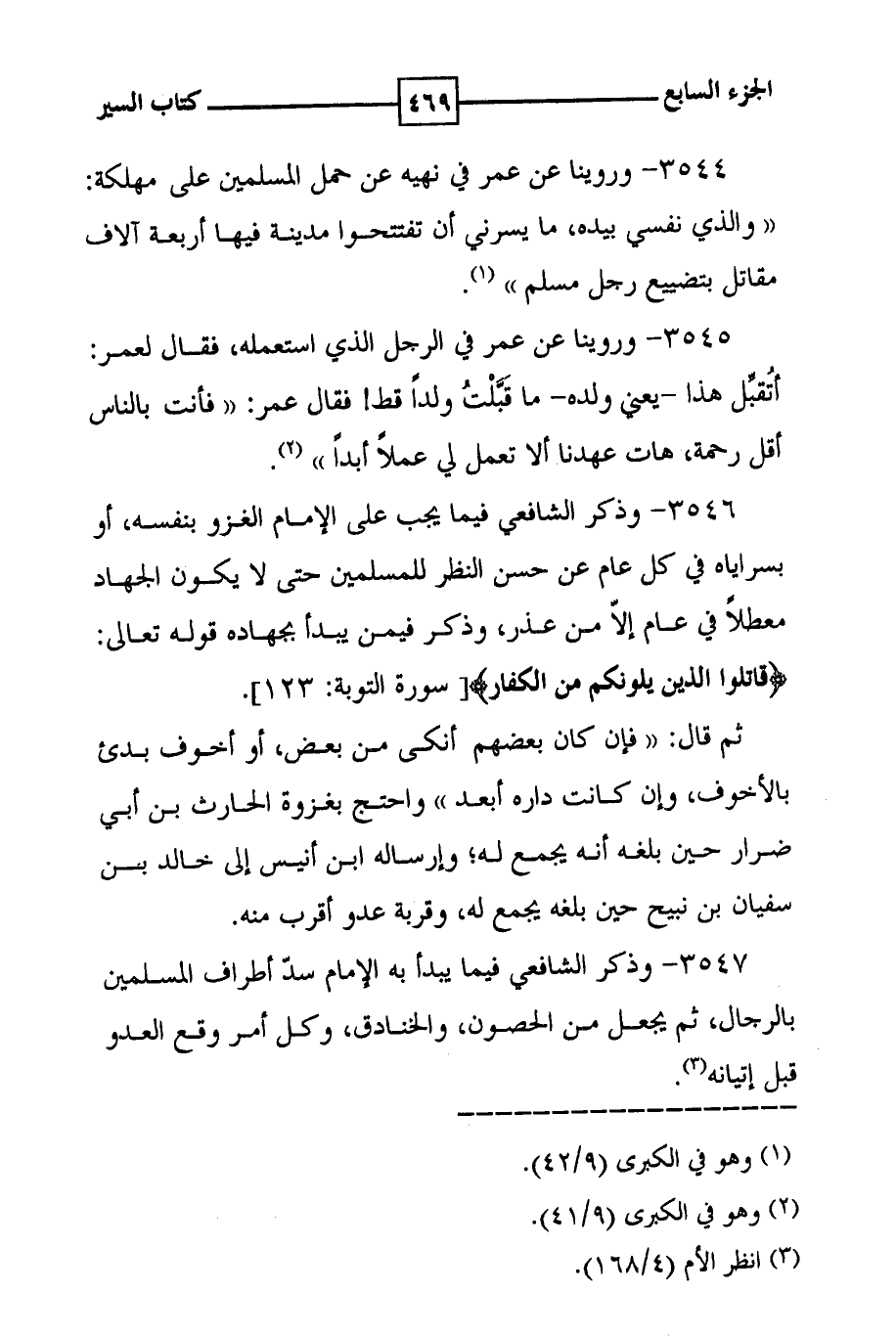 3547 - وذكر الشافعي فيما يبدأ به الإمام سد أطراف المسلمين بالرجال ، ثم يجعل من الحصون ، والخنادق ، وكل أمر رقع العدو قبل إتيانه ( 3 ) .