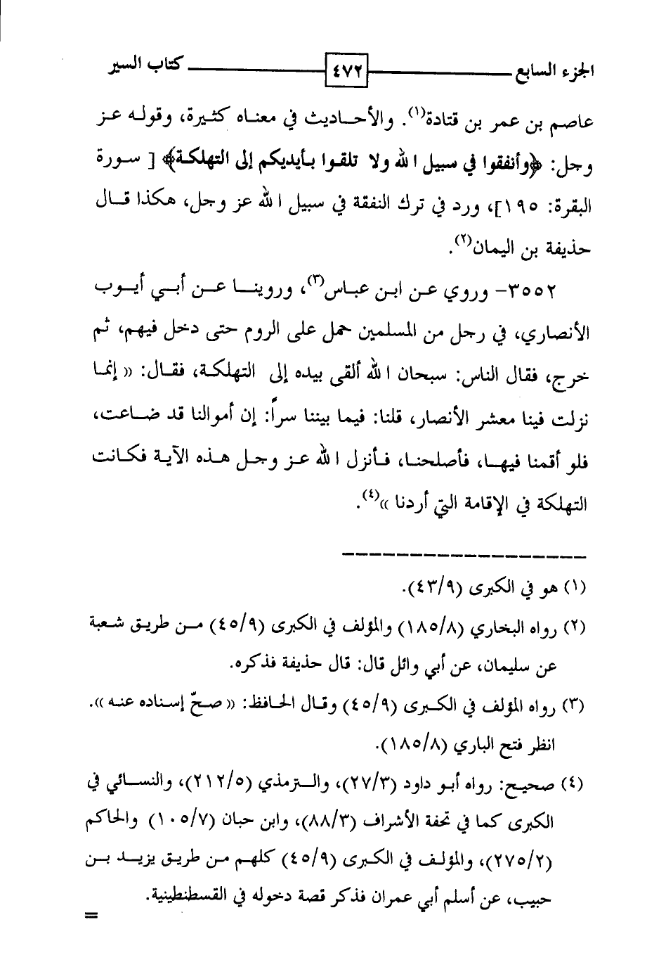 عاصم بن عمر بن قتادة ( 1 ) . والأحاديث في معناه كثيرة ، وقوله عز وجل : ! ( وأنفقوا في سبيل الله ولا تلقوا بأيديكم إلى التهلكة ) ! [ سورة البقرة : 195 ] ، ورد في ترك النفقة في سبيل الله عز وجل ، هكذا قال حذيفة بن اليمان ( 2 ) .