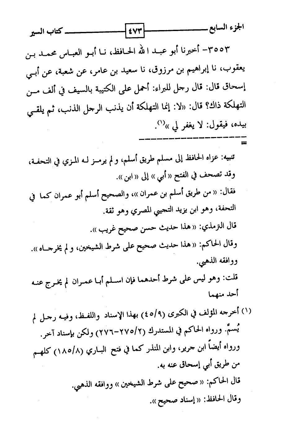 3553 - أخبرنا أبو عبد الله الحافظ ، نا أبو العباس محمد بن يعقوب ، نا إبراهيم بن مرزوق ، نا سعيد بن عامر ، عن شعبة ، عن أبي إسحاق قال : قال رجل للبراء : أحمل على الكتيبة بالسيف في ألف من التهلكة ذاك ؟ قال : ( ( لا : إنما التهلكة أن يذنب الرجل الذنب ، ثم يلقي بيده ، فيقول : لا يغفر لي ) ) ( 1 ) .