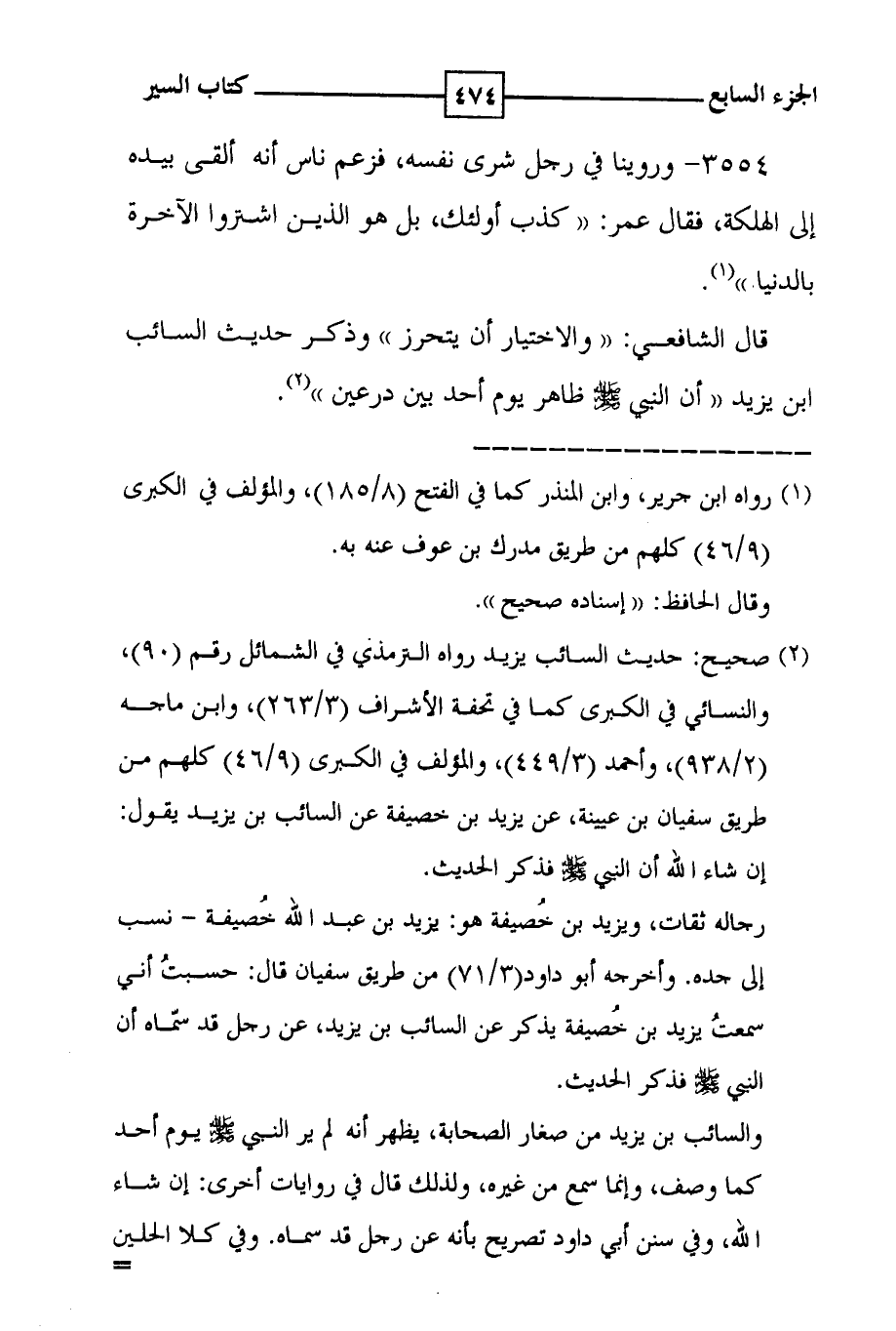 3554 - وروينا في رجل شرى نفسه ، فزعم ناس أنه ألقى بيده إلى الهلكة ، فقال عمر : ( ( كذب أولئك ، بل هو الذين اشتروا الآخرة بالدنيا ) ) ( 1 ) . قال الشافعي : ( ( والاختيار أن يتحرز ) ) وذكر حديث السائب ابن يزيد ( ( أن النبي صلى الله عليه وسلم ظاهر يوم أحد بين درعين ) ) ( 2 ) .