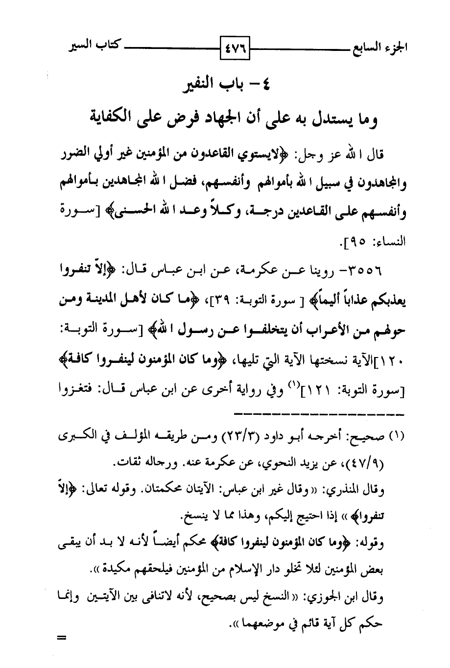 3556 - روينا عن عكرمة ، عن ابن عباس قال : ( إلا تنفروا يعذبكم عذاباً أليماً ) [ سورة التوبة : 39 ] ، ( ما كان لأهل المدينة ومن حولهم من الأعراب أن يتخلفوا عن رسول الله ) [ سورة التوبة : 120 ] الآية نسختها الآية التي تليها ، ( وما كان المؤمنون لينفروا كافة ) [ سورة التوبة : 121 ] ( 1 ) وفي رواية أخرى عن ابن عباس قال : فتغزوا