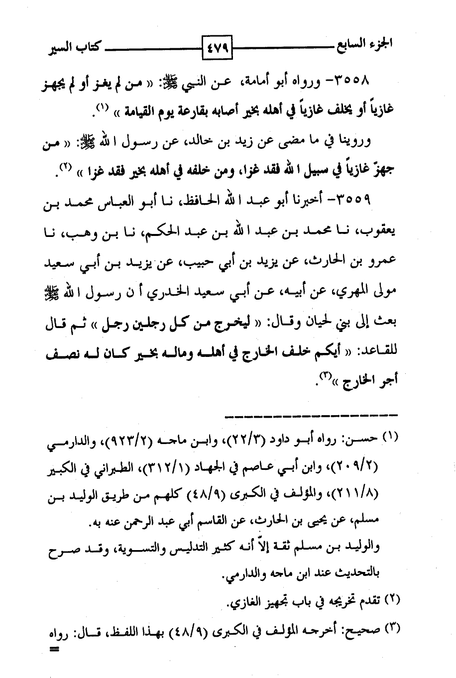 3558 - ورواه أبو أمامة ، عن النبي صلى الله عليه وسلم : ( ( من لم يغز أو لم يجهز غازياً أو يخلف غازياً في أهله بخير أصابه بقارعة يوم القيامة ) ) ( 1 ) . وروينا في ما مضى عن زيد بن خالد ، عن رسول الله صلى الله عليه وسلم : ( ( من جهز غازياً في سبيل الله فقد غزا ، ومن خلفه في أهله بخير فقد غزا ) ) ( 2 ) .