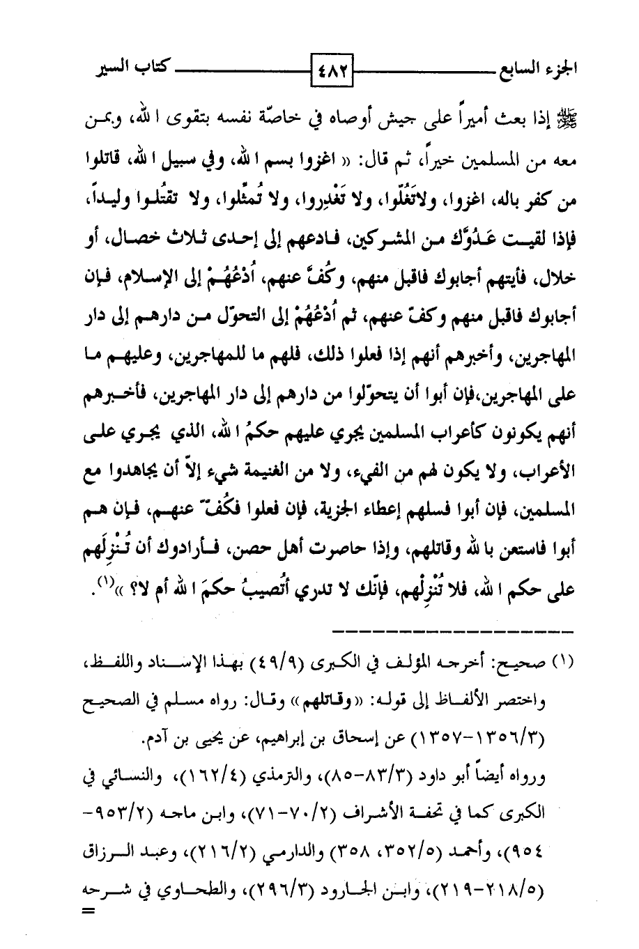 صلى الله عليه وسلم إذا بعث أميراً على جيش أوصاه في خاصة نفسه بتقوى الله ، وبمن معه من المسلمين خيراً ، ثم قال : ( ( اغزوا بسم الله ، وفي سبيل الله ، قاتلوا من كفر باله ، اغزوا ، ولا تغلوا ، ولا تغدروا ، ولا تمثلوا ، ولا تقتلوا وليداً ، فإذا لقيت عدوك من المشركين ، فادعهم إلى إحدى ثلاث خصال ، أو خلال ، فأيتهم أجابوك فاقبل منهم ، وكف عنهم ، ادعهم إلى الإسلام ، فإن أجابوك فاقبل منهم وكف عنهم ، ثم أدعهم إلى التحول من دارهم إلى دار المهاجرين ، وأخبرهم أنهم إذا فعلوا ذلك ، فلهم ما للمهاجرين ، وعليهم ما على المهاجرين ، فإن أبوا أن يتحولوا من دارهم إلى دار المهاجرين ، فأخبرهم أنهم يكونون كأعراب المسلمين يجري عليهم حكم الله ، الذي يجري على الأعراب ، ولا يكون لهم من الفيء ، ولا من الغنيمة شيء إلا أن يجاهدوا مع المسلمين ، فإن أبوا فسلهم إعطاء الجزية ، فإن فعلوا فكف عنهم ، فإن هم أبو فاستعن بالله وقاتلهم ، وإذا حاصرت أهل حصن ، فأرادوك أن تنزلهم على حكم الله ، فلا تنزلهم ، فإنك لا تدري أتصيب حكم الله أم لا ؟ ) ) ( 1 ) .