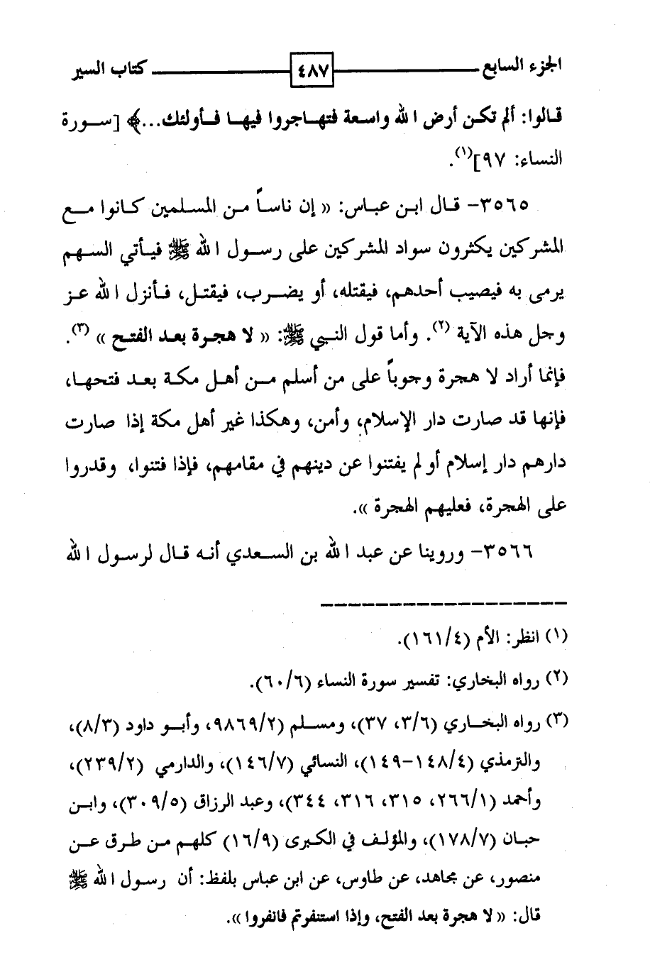 3565 - قال ابن عباس : ( ( إن ناساً من المسلمين كانوا مع المشركين يكثرون سواد المشركين على رسول الله صلى الله عليه وسلم فيأتي السهم يرمى به فيصيب أحدهم ، فيقتله ، أو يضرب ، فيقتل ، فأنزل الله عز وجل هذه الآية ( 2 ) . وأما قول النبي صلى الله عليه وسلم : ( ( لا هجرة بعد الفتح ) ) ( 3 ) . فإنما أراد لا هجرة وجوباً على من أسلم من أهل مكة بعد فتحها ، فإنها قد صارت دار الإسلام ، وأمن ، وهكذا غير أهل مكة إذا صارت دارهم دار إسلام أو لم يفتنوا عن دينهم في مقامهم ، فإذا فتنوا ، وقدروا على الهجرة ، فعليهم الهجرة ) ) .