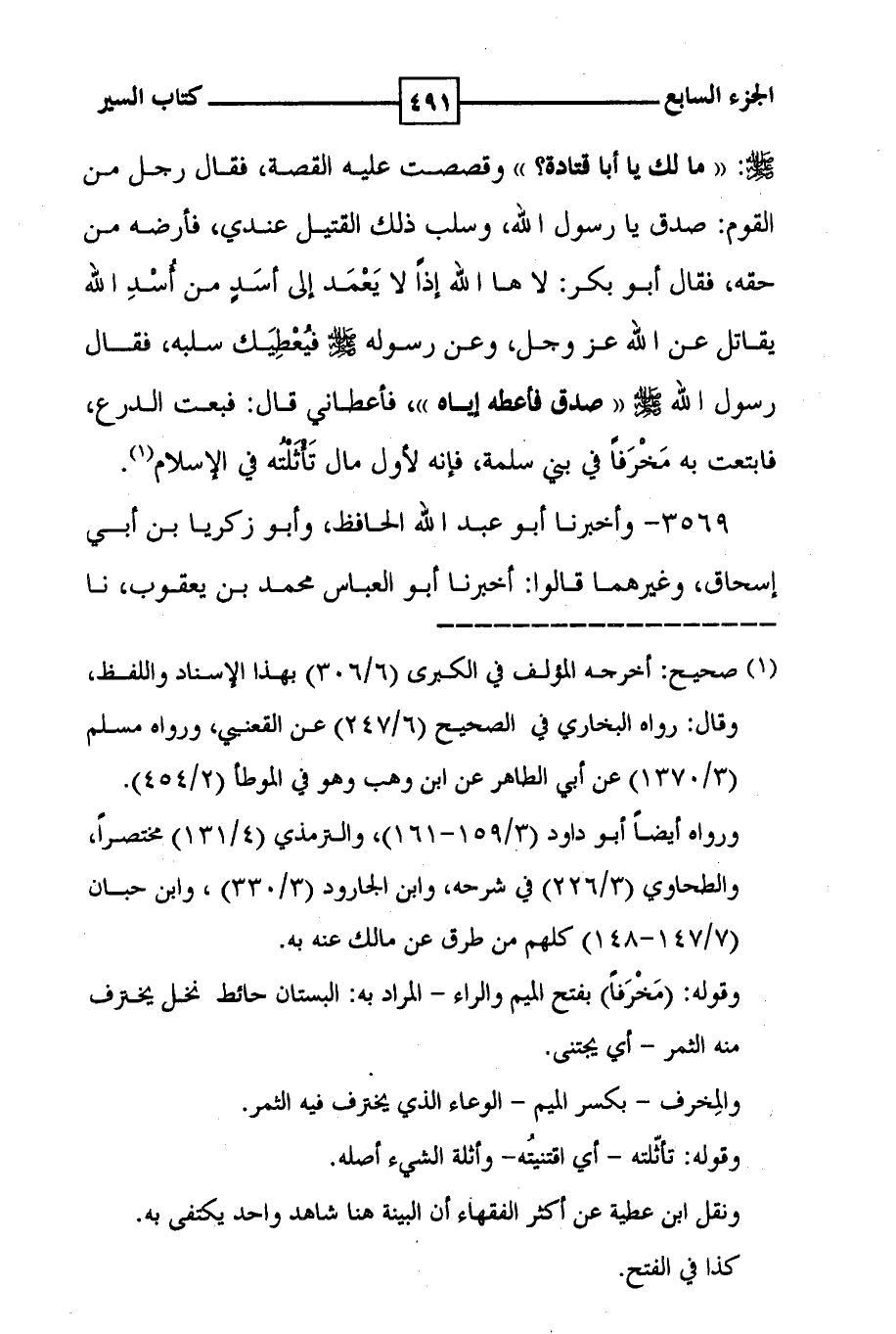 صلى الله عليه وسلم : ( ( ما لك يا أبا قتادة ؟ ) ) وقصصت عليه القصة ، فقال رجل من القوم : صدق يا رسول الله ، وسلب ذلك القتيل عندي ، فأرضه من حقه ، فقال أبو بكر : لا ها الله إذا لا يعمد إلى أسد من أسد الله يقاتل عن الله عز وجل ، وعن رسوله صلى الله عليه وسلم فيعطيك سلبه ، فقال رسول الله صلى الله عليه وسلم ( ( صدق فأعطه إياه ) ) ، فأعطاني قال : فبعت الدرع ، فابتعت به مخرفاً في بني سلمة ، فإنه لأول مال تأثلته في الإسلام ( 1 ) .
