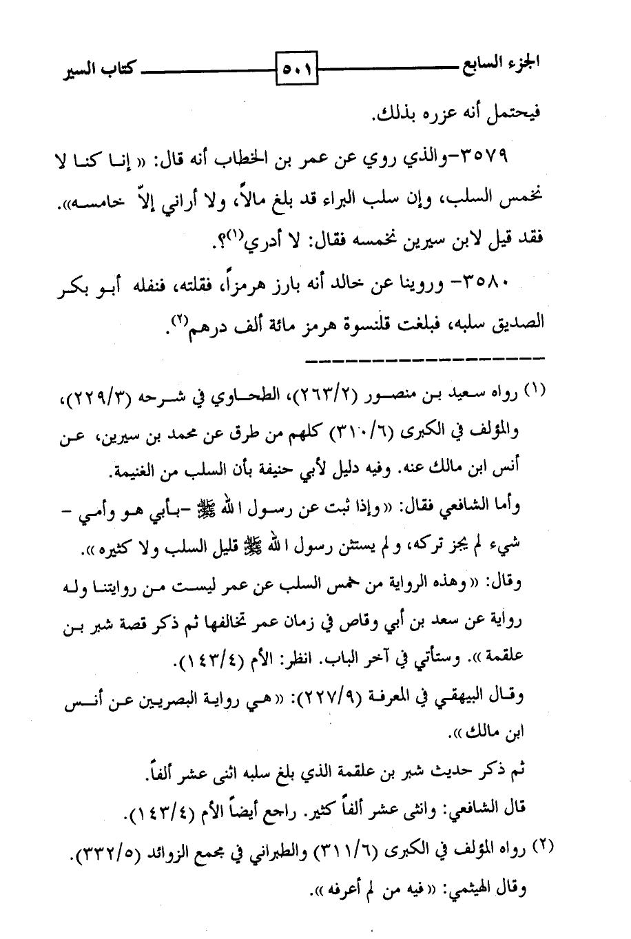 3579 - والذي روي عن عمر بن الخطاب أنه قال : ( ( إنا كنا لا تخمس السلب ، وإن سلب البراء قد بلغ مالاً ، ولا أراني إلا خامسه ) ) . فقد قيل لابن سيرين تخمسه فقال : لا أدري ( 1 ) ؟ .