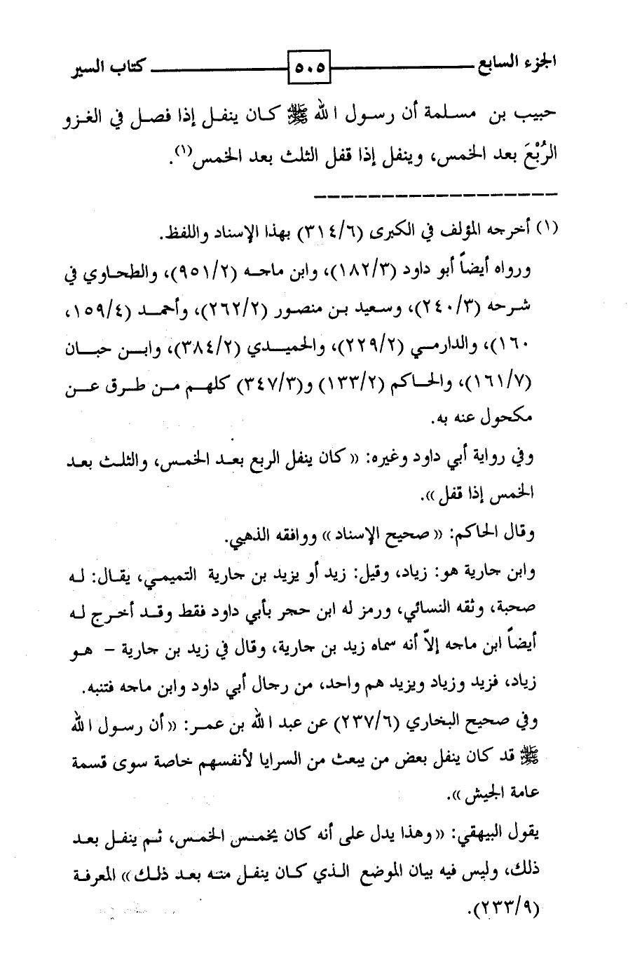 حبيب بن مسلمة أن رسول الله صلى الله عليه وسلم كان ينفل إذا فصل في الغزو الربع بعد الخمس ، وينفل إذا قفل الثلث بعد الخمس ( 1 ) .