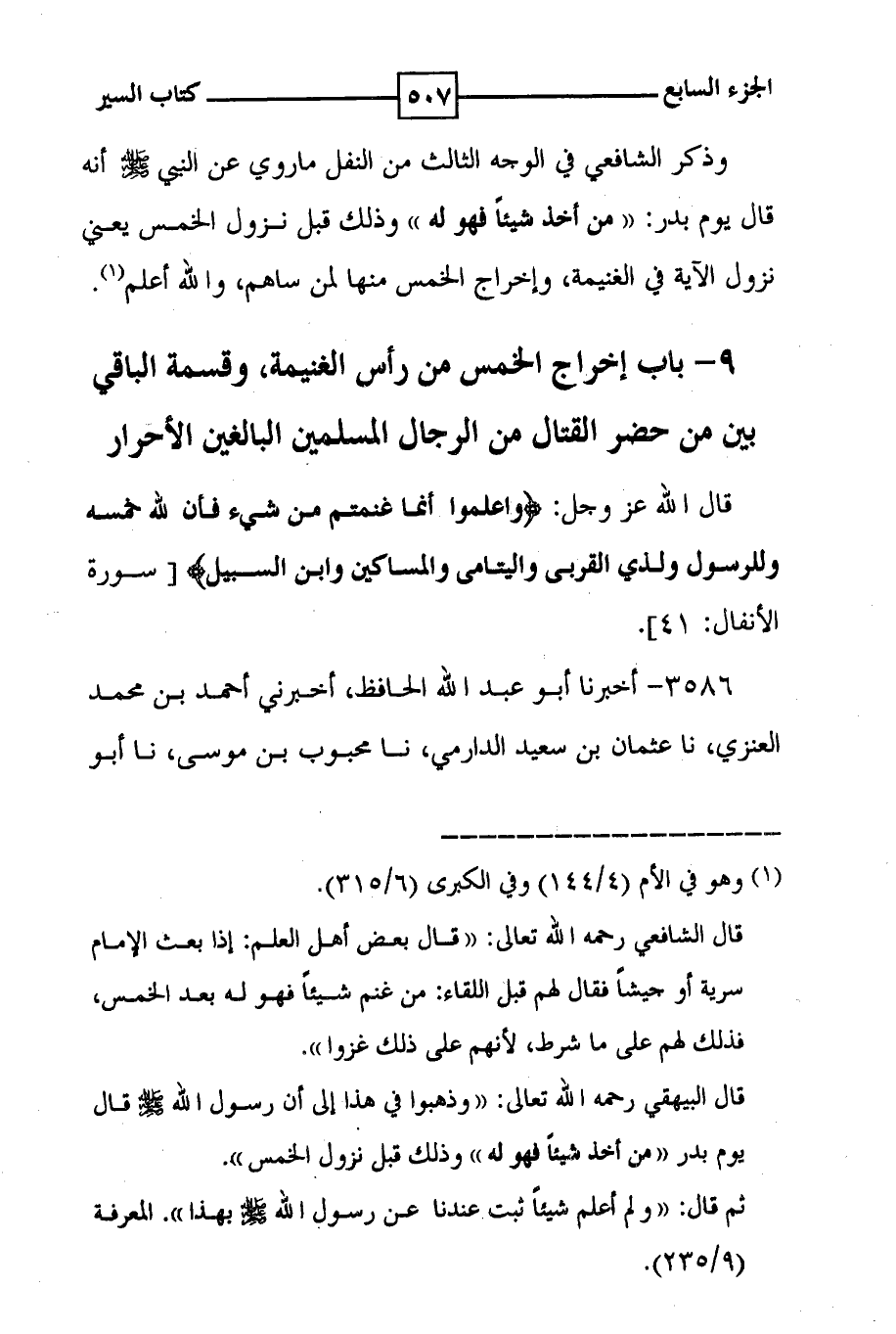 وذكر الشافعي في الوجه الثالث من النفل ماروي عن النبي صلى الله عليه وسلم أنه قال يوم بدر : ( ( من أخذ شيئاً فهو له ) ) وذلك قبل نزول الخمس يعني نزول الآية في الغنيمة ، وإخراج الخمس منها لمن ساهم ، والله أعلم ( 1 ) . 9 - باب إخراج الخمس من رأس الغنيمة ، وقسمة الباقي بين من حضر القتال من الرجال المسلمين البالغين الأحرار قال الله عز وجل : ( واعلموا إنما غنمتم من شيء فأن لله خمسة وللرسول الله ولذي القربى واليتامى والمساكين وابن السبيل ) [ سورة الأنفال : 41 ] .