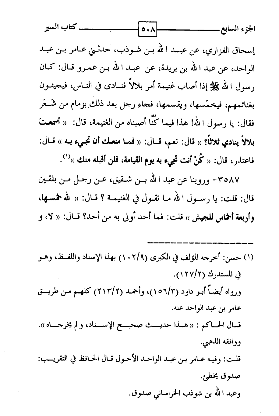 إسحاق الفراري ، عن عبد الله بن شوذب ، حدثني عامر بن عبد الواحد ، عن عبد الله بن بريدة ، عن عبد الله بن عمرو قال : كان رسول الله صلى الله عليه وسلم إذا أصاب غنيمة أمر بلالاً فنادى في الناس ، فيجيئون بغنائمهم ، فيخمسها ، ويقسمها ، فجاء رجل بعد ذلك بزمام من شعر فقال : يا رسول الله ! هذا فيما كنا أصبناه من الغنيمة ، قال : ( ( أسمعت بلالاً ينادي ثلاثاً ؟ ) ) قال : نعم ، قال : ( ( فما منعك أن تجيء به ) ) قال : فاعتذر ، قال : ( ( كن أنت تجيء به يوم القيامة ، فلن أقبله منك ) ) ( 2 ) .