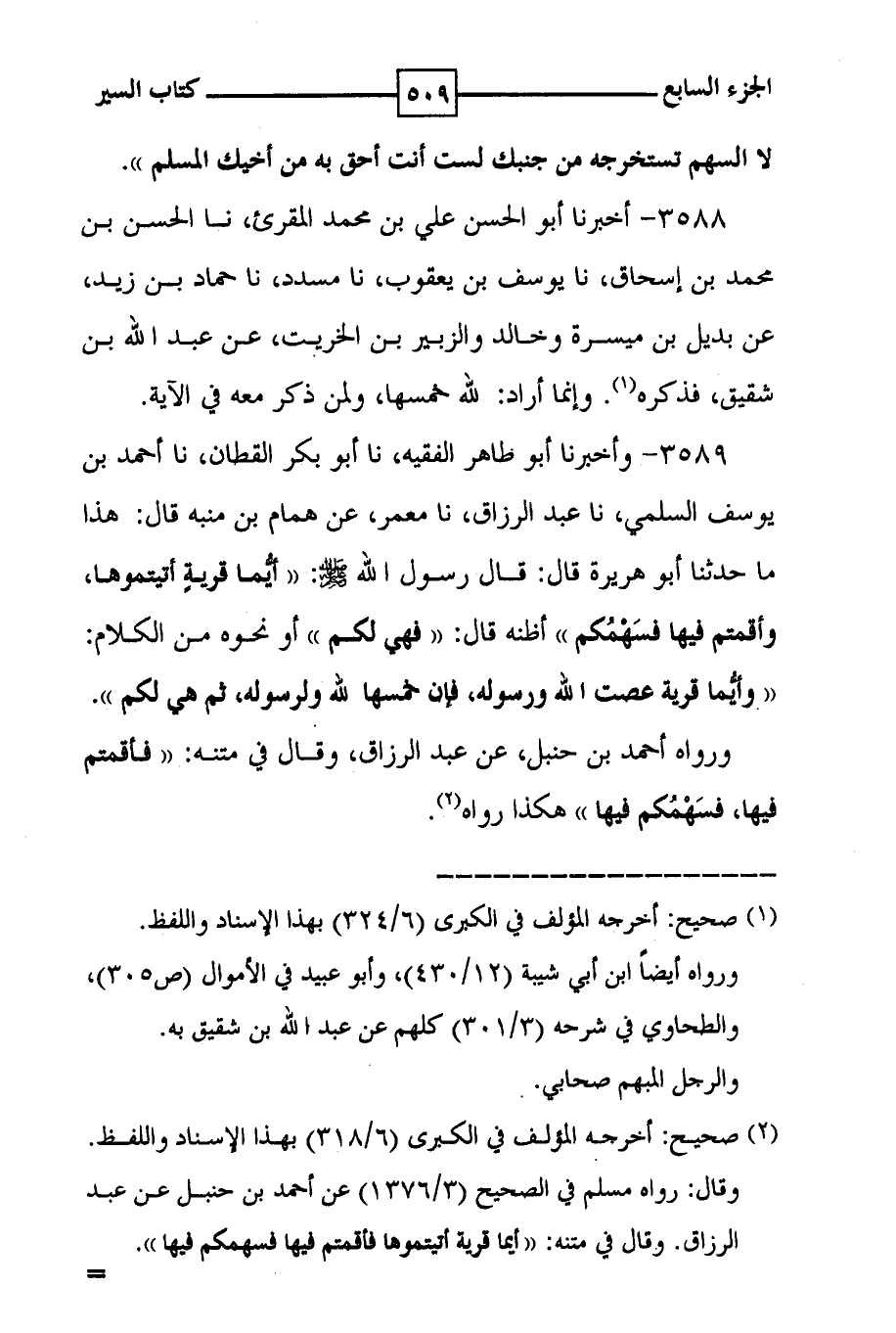 3589 - وأخبرنا أبو طاهر الفقيه ، نا أبو بكر القطان ، نا أحمد بن يوسف السلمي ، نا عبد الرزاق ، نا معمر ، عن همام بن منبه قال : هذا ما حدثنا أبو هريرة قال : قال رسول الله صلى الله عليه وسلم : ( ( إيما قرية أتيتموها ، وأقمتم فيها فسهمكم ) ) أظنه قال : ( ( فهي لكم ) ) أو نحوه من الكلام : ( ( وأيما قرية عصت الله ورسوله ، فإن خمسها لله ولرسوله ، ثم هي لكم ) ) . ورواه أحمد بن حنبل ، عن عبد الرزاق ، وقال في متنه : ( ( فأقمتم فيها ، فسهمكم فيها ) ) هكذا رواه ( 2 ) .