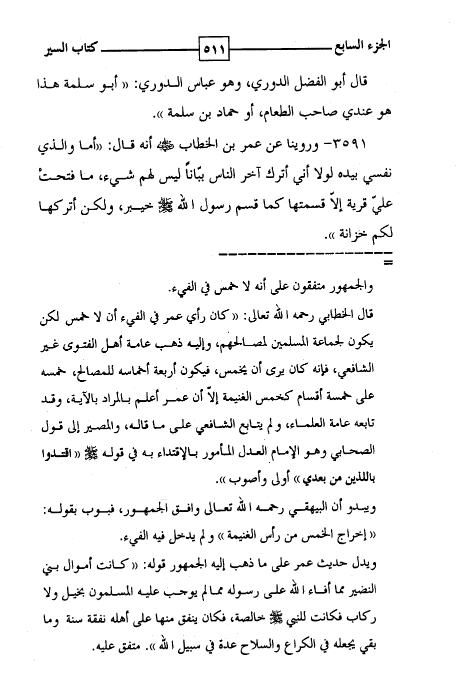 3591 - وروينا عن عمر بن الخطاب أنه قال : ( ( أما والذي نفسي بيده لولا أني أترك آخر الناس بباناً ليس لهم شيء ، ما فتحت علي قرية إلا قسمتها كما قسم رسول الله صلى الله عليه وسلم خيبر ، ولكن أتركها لكم خزانة ) ) .