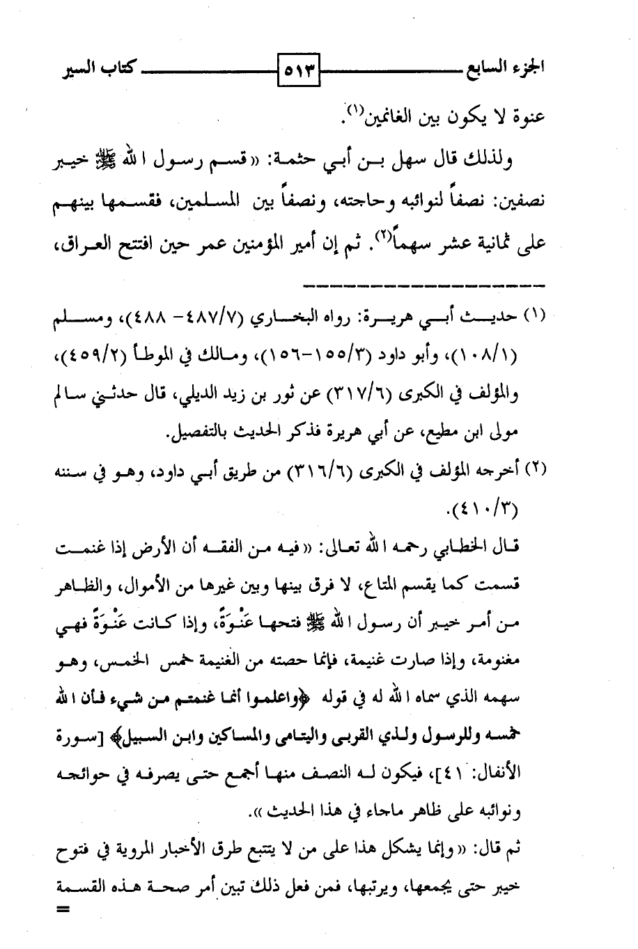 عنوة لا يكون بين الغانمين ( 1 ) . ولذلك قال سهل بن أبي حثمة : ( ( قسم رسول الله صلى الله عليه وسلم خيبر نصفين : نصفاً لنوائبه وحاجته ، ونصفاً بين المسلمين ، فقسمها بينهم على ثمانية عشر سهماً ( 2 ) . ثم إن أمير المؤمنين عمر حين افتتح العراق ،