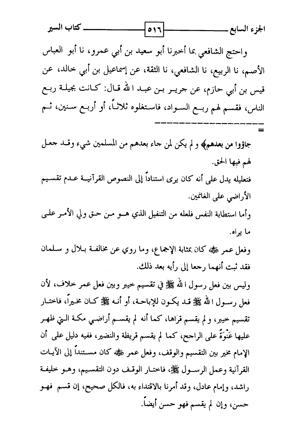 واحتج الشافعي بما أخبرنا أبو سعيد بن أبي عمرو ، نا أبو العباس الأصم ، نا الربيع ، نا الشافعي ، نا الثقة ، عن إسماعيل بن أبي خالد ، عن قيس بن أبي حازم ، عن جرير بن عبد الله قال : كانت بجيلة ربع الناس ، فقسم لهم ربع السواد ، فاستغلوه ثلاثاً ، أو أربع سنين ، ثم