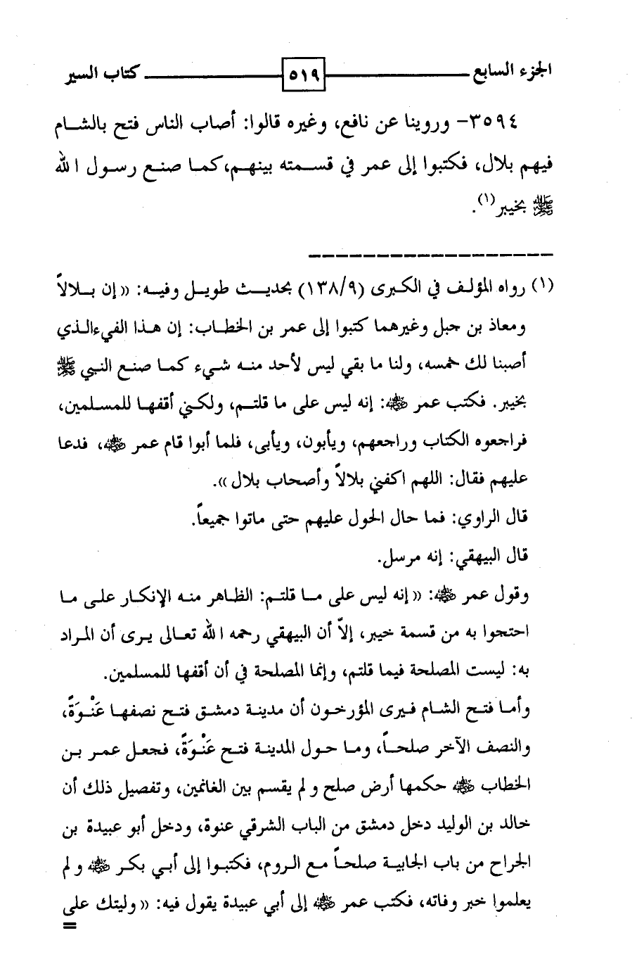 3594 - وروينا عن نافع ، وغيره قالوا : أصاب الناس فتح بالشام فيهم بلال ، فكتبوا إلى عمر في قسمته بينهم ، كما صنع رسول الله صلى الله عليه وسلم بخيبر ( 1 ) .