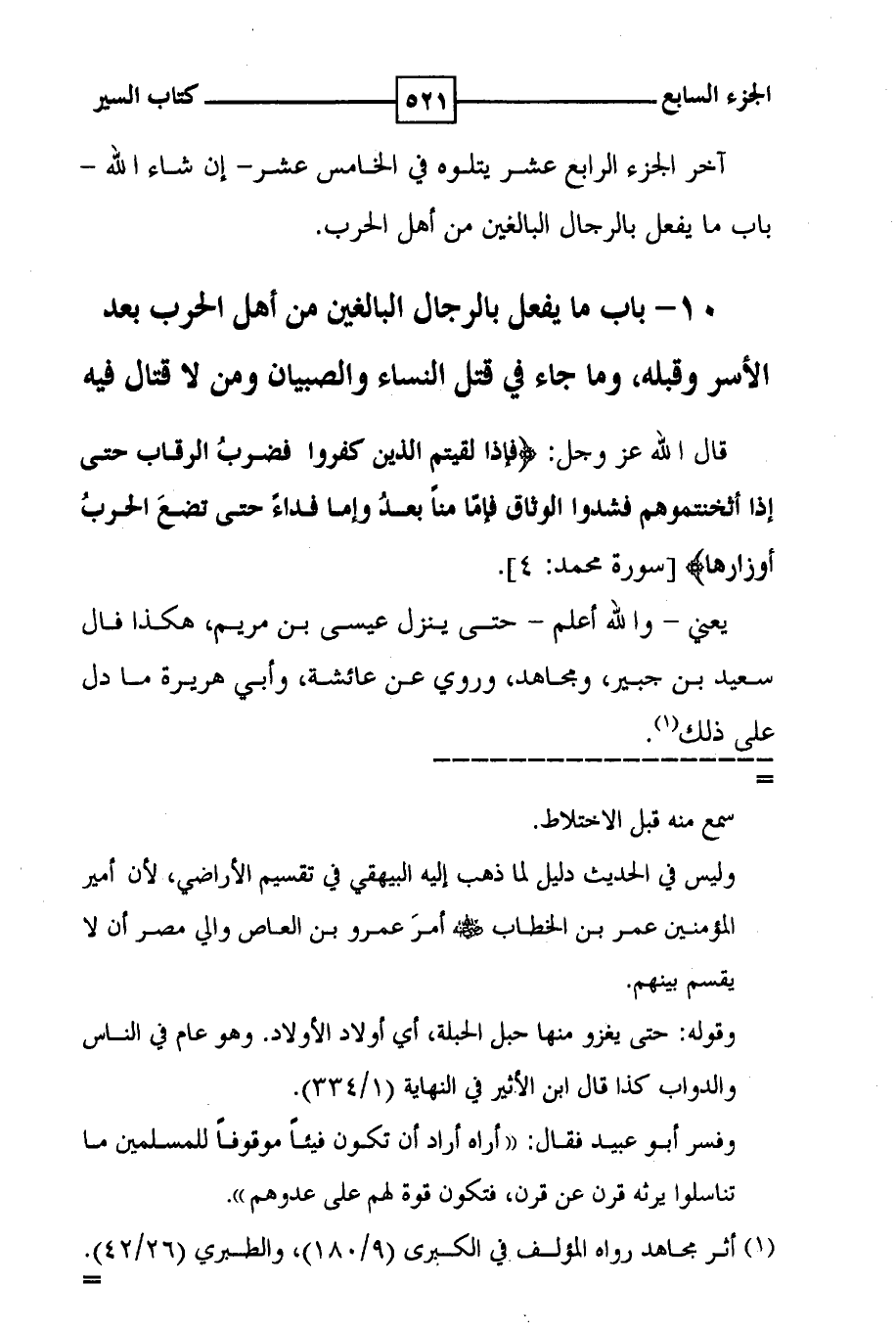 آخر الجزء الرابع عشر يتلوه في الخامس عشر - إن شاء الله - باب ما يفعل بالرجال البالغين من أهل الحرب . 10 - باب ما يفعل بالرجال البالغين من أهل الحرب بعد الأسر وقبله ، وما جاء في قتل النساء والصبيان ومن لا قتال فيه قال الله عز وجل : ! ( فإذا لقيتم الذين كفروا فضرب الرقاب حتى إذا أثخنتموهم فشدوا الوثاق فإما منا بعد وإما فداء حتى تضع الحرب أوزارها ) ! [ سورة محمد : 4 ] . يعني - والله أعلم - حتى ينزل عيسى بن مريم ، هكذا قال سعيد بن جبير ، ومجاهد ، وروي عن عائشة ، وأبي هريرة ما دل على ذلك ( 1 ) .