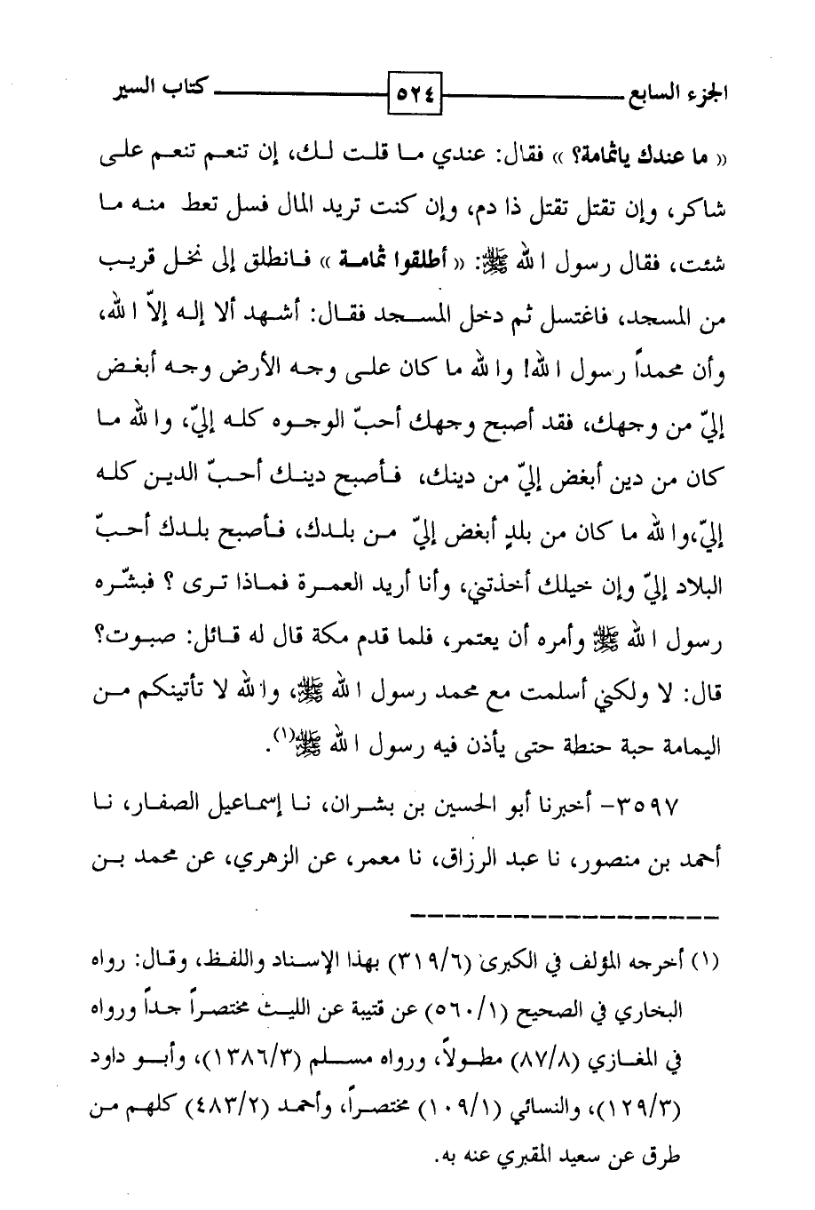 ( ( ما عندك باثمامة ؟ ) ) فقال : عندي ما قلت لك ، إن تنعم تنعم على شاكر ، وإن تقتل تقتل ذا دم ، وإن كنت تريد المال فسل تعط منه ما شئت ، فقال رسول الله صلى الله عليه وسلم : ( ( أطلقوا ثمامة ) ) فانطلق إلى نخل قريب من المسجد ، فاغتسل ثم دخل المسجد فقال : أشهد ألا إله إلا الله ، وأن محمداً رسول الله ! والله ما كان على وجه الأرض وجه أبغض إلي من وجهك ، فقد أصبح وجهك أحب الوجوه كله إلي ، والله ما كان من دين أبغض إلي من دينك ، فأصبح دينك أحب الدين كله إلي ، والله ما كان من بلد أبغض إلي من بلدك ، فأصبح بلدك أحب البلاد إلي وإن خيلك أخذتني ، وأنا أريد العمرة فماذا ترى ؟ فبشره رسول الله صلى الله عليه وسلم وأمره أن يعتمر ، فلما قدم مكة قال له قائل : صبوت ؟ قال : لا ولكني أسلمت مع محمد رسول الله صلى الله عليه وسلم ، والله لا تأتينكم من اليمامة حبة حنطة حتى يأذن فيه رسول الله صلى الله عليه وسلم ( 1 ) .
