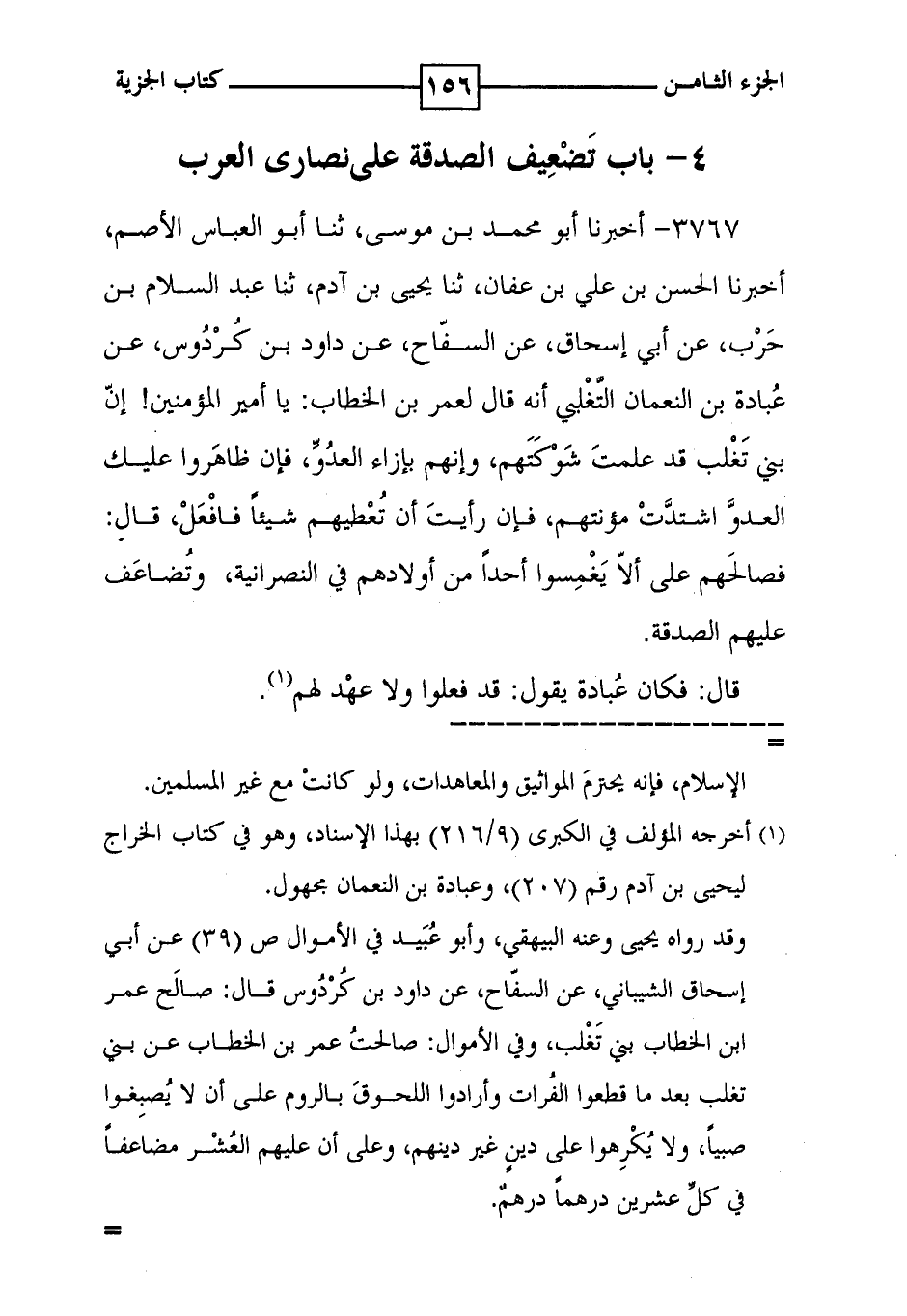 3767 - أخبرنا أبو محمد بن موسى ، ثنا أبو العباس الأصم ، أخبرنا الحسن بن علي بن عفان ، ثنا يحيى بن آدم ، ثنا عبد السلام بن حرب ، عن أبي إسحاق ، عن السفاح ، عن داود بن كردوس ، عن عبادة بن النعمان التغلبي أنه قال لعمر بن الخطاب : يا أمير المؤمنين ! إن بني تغلب قد علمت شوكتهم ، وإنهم بإزاء العدو ، فإن ظاهروا عليك العدو اشتدت مؤنتهم ، فإن رأيت أن تعطيهم شيئاً فافعل ، قال : فصالحهم على ألا يغمسوا أحداً من أولادهم في النصرانية ، وتضاعف عليهم الصدقة . قال : فكان عبادة يقول : قد فعلوا ولا عهد لهم ( 1 ) .