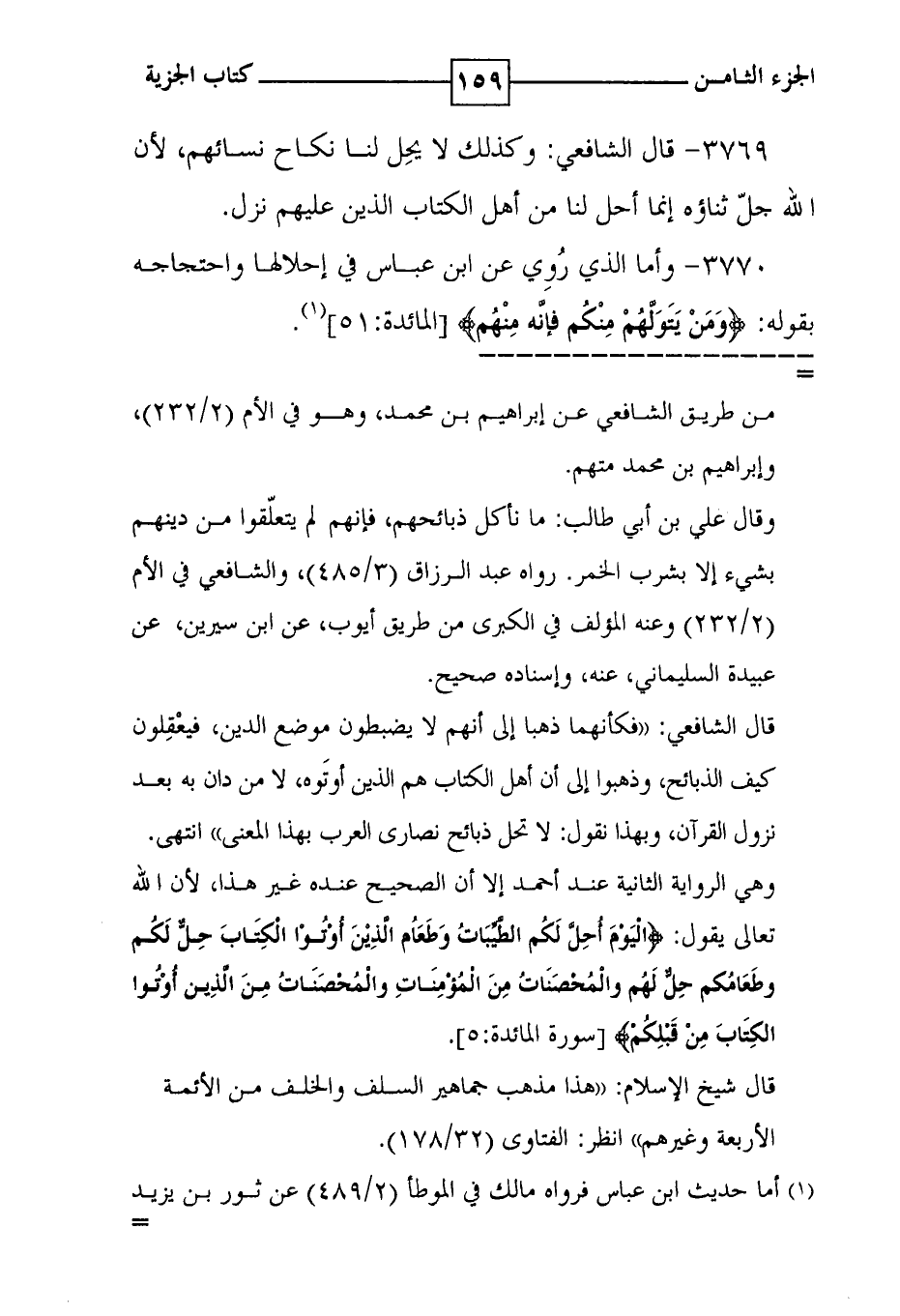 3770 - وأما الذي روي عن ابن عباس في إحلالها واحتجاجه بقوله : ! ( ومن يتولهم منكم فإنه منهم ) ! [ المائدة : 51 ] ( 1 ) .