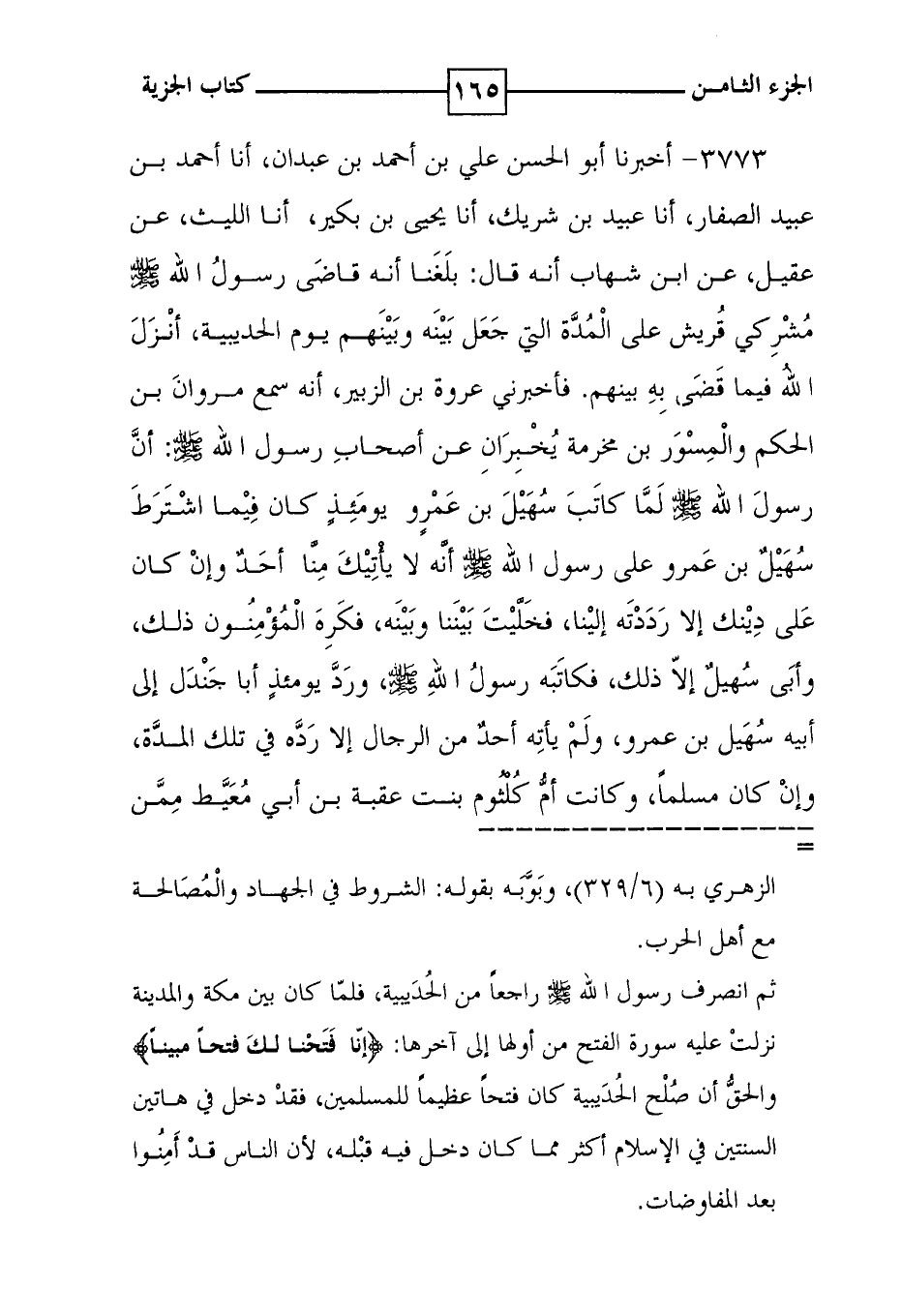 3773 - أخبرنا أبو الحسن علي بن أحمد بن عبدان ، أنا أحمد بن عبيد الصفار ، أنا عبيد بن شريك ، أنا يحيى بن بكير ، أنا الليث ، عن عقيل ، عن ابن شهاب أنه قال : بلغنا أنه قاضى رسول الله صلى الله عليه وسلم مشركي قريش على المدة التي جعل بينه وبينهم يوم الحديبية ، أنزل الله فيما مضى به بينهم . فأخبرني عروة بن الزبير ، أنه سمع مروان بن الحكم والمسور بن مخرمة يخبران عن أصحاب رسول الله صلى الله عليه وسلم : أن رسول الله صلى الله عليه وسلم لما كاتب سهيل بن عمرو يومئذ كان فيما اشترط سهيل بن عمرو على رسول الله صلى الله عليه وسلم أنه لا يأتيك منا أحد وإن كان على دينك إلا رددته إلينا ، فخليت بيننا وبينه ، فكره المؤمنون ذلك ، وأبى سهيل إلا ذلك ، فكاتبه رسول الله صلى الله عليه وسلم ، ورد يومئذ أبا جندل إلى أبيه سهيل بن عمرو ، ولم يأته أحد من الرجال إلا رده في تلك المدة ، وإن كان مسلماً ، وكانت أم كلثوم بنت عقبة بن أبي معيط ممن