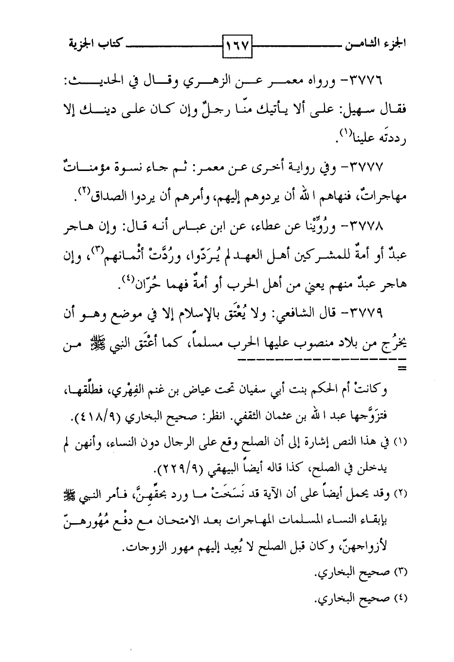 3777 - وفي رواية أخرى عن معمر : ثم جاء نسوة مؤمنات مهاجرات ، فنهاهم الله أن يردوهم إليهم ، وأمرهم أن يردوا الصداق ( 2 ) .