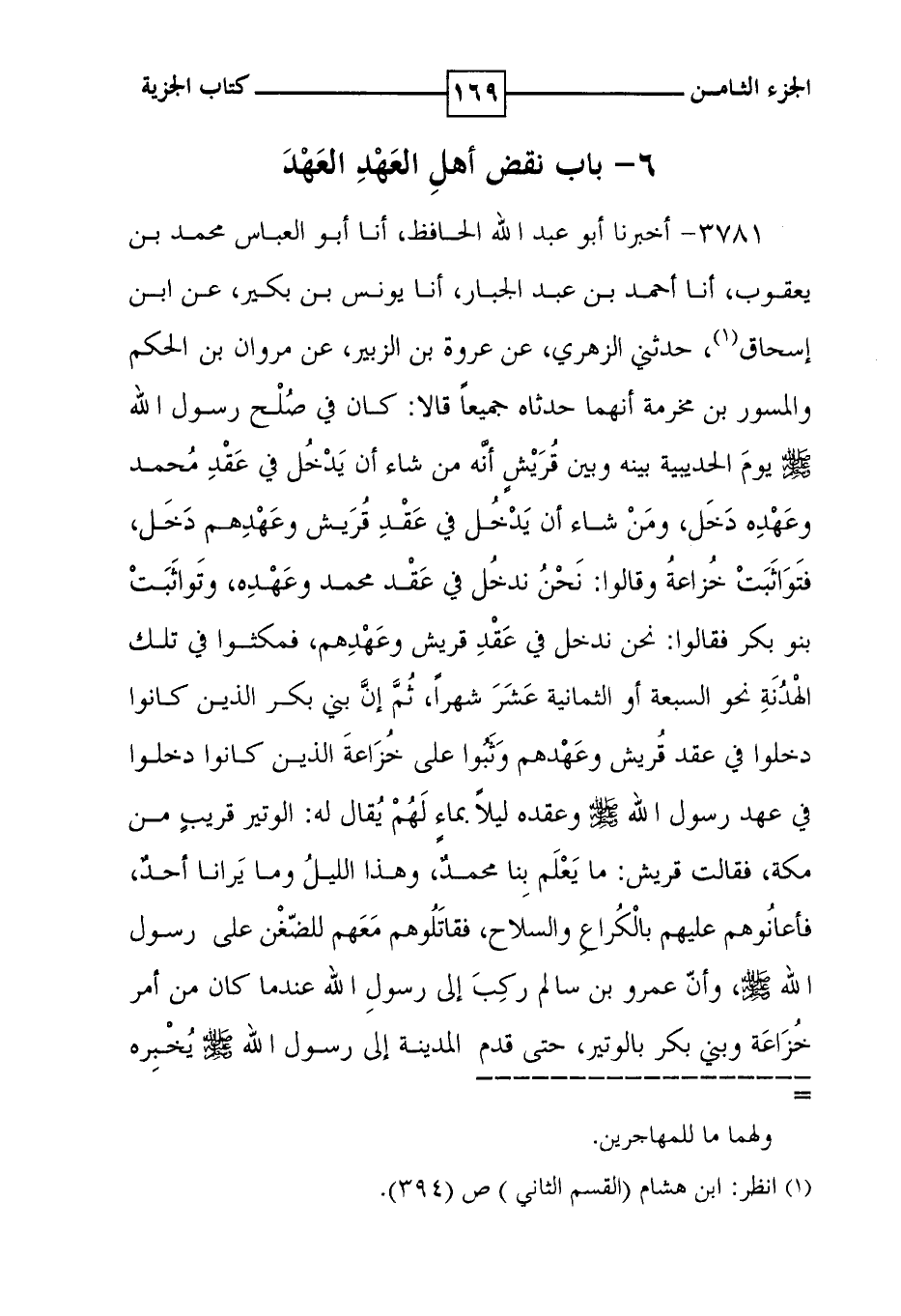 3781 - أخبرنا أبو عبد الله الحافظ ، أنا أبو العباس محمد بن يعقوب ، أنا أحمد بن عبد الجبار ، أنا يونس بن بكير ، عن ابن إسحاق ( 1 ) ، حدثني الزهري ، عن عروة بن الزبير ، عن مروان بن الحكم والمسور بن مخرمة أنهما حدثاه جميعاً قالا : كان في صلح رسول الله صلى الله عليه وسلم يوم الحديبية بينه وبين قريش أنه من شاء أن يدخل في عقد محمد وعهده دخل ، ومن شاء أن يدخل في عقد قريش وعهدهم دخل ، فتواثبت خزاعة وقالوا : نحن ندخل في عقد محمد وعهده ، وتواثبت بنو بكر فقالوا : نحن ندخل في عقد قريش وعهدهم ، فمكثوا في تلك الهدنة نحو السبعة أو الثمانية عشر شهراً ، ثم إن بني بكر الذين كانوا دخلوا في عقد قريش وعهدهم وثبوا على خزاعة الذين كانوا دخلوا في عهد رسول الله صلى الله عليه وسلم وعقده ليلاً بماء لهم يقال له : الوتير قريب من مكة ، فقالت قريش : ما يعلم بنا محمد ، وهذا الليل وما يرانا أحد ، فأعانوهم عليهم بالكراع والسلاح ، فقاتلوهم معهم للضغن على رسول الله صلى الله عليه وسلم ، وأن عمرو بن سالم ركب إلى رسول الله عندما كان من أمر خزاعة وبني بكر بالوتير ، حتى قدم المدينة إلى رسول الله صلى الله عليه وسلم يخبره