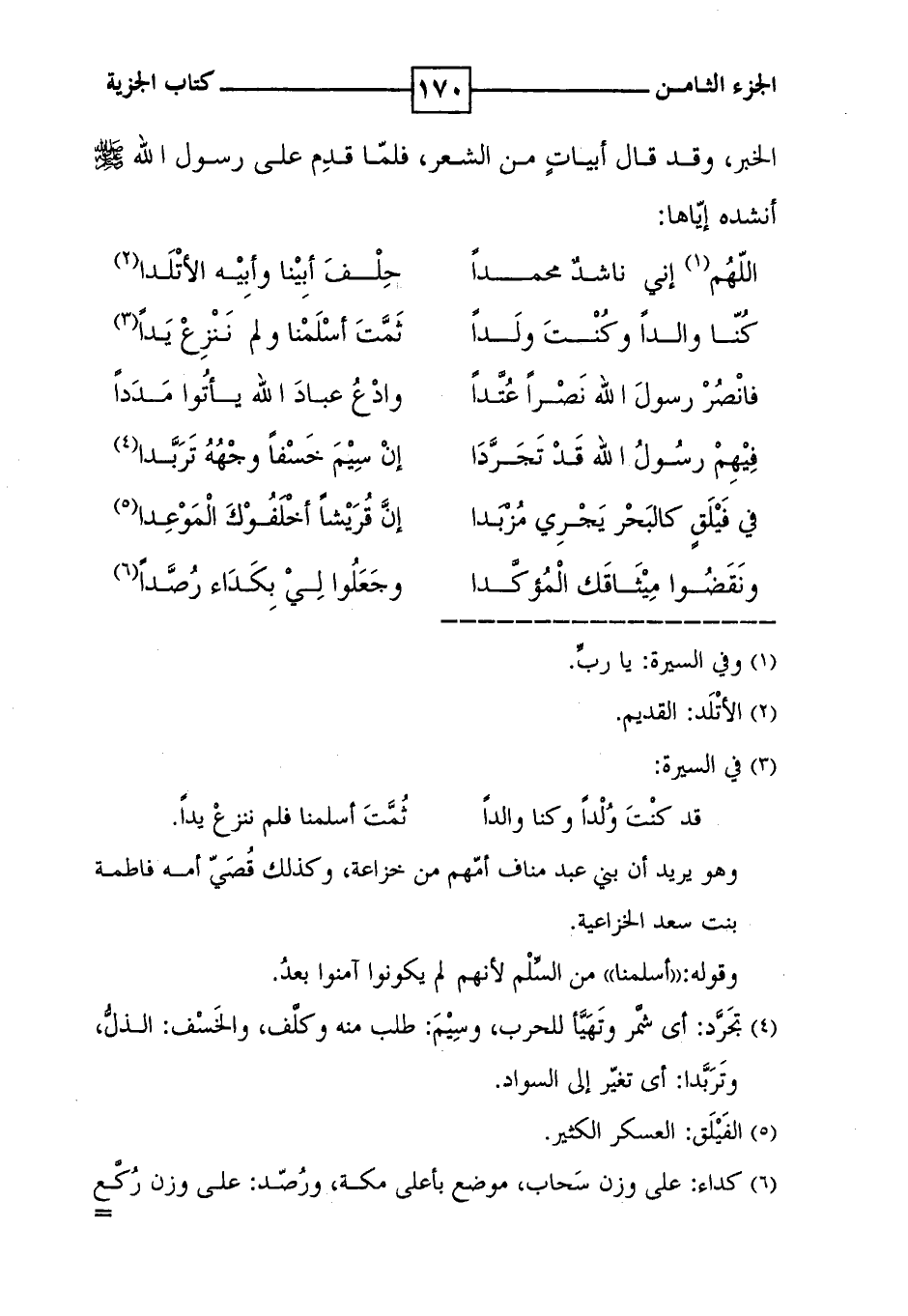 الخبر ، وقد قال أبيات من الشعر ، فلما قدم على رسول الله صلى الله عليه وسلم أنشده إياها : ( اللهم ( 1 ) إني ناشد محمداً ** حلف أبينا وأبيه الأتلدا ( 2 ) ) ( كنا والداً وكنت ولداً ** ثمت أسلمنا ولم ننزع يداً ( 3 ) ) ( فانصر رسول الله نصراً عتداً ** وادع عباد الله يأتوا مدداً ) ( فيهم رسول الله قد تجردا ** إن سيم خسفاً وجهه تربداً ( 4 ) ) ( في فيلق كالبحر يجري مزبداً ** إن قريشاً أخلفوك الموعدا ( 5 ) ) ( ونقضوا ميثاقك المؤكدا ** وجعلوا لي بكداء رصداً ( 6 ) )