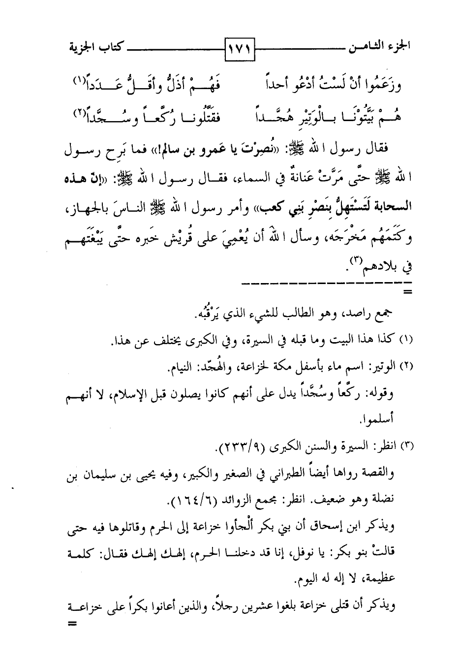 ( وزعموا أن لست أدعو أحداً ** فهم أذل وأقل عدداً ( 1 ) ) ( هم بيتوناً بالوتير هجداً ** فقتلونا ركعاً وسجداً ( 2 ) ) فقال رسول الله صلى الله عليه وسلم : ' نصرت يا عمرو بن سالم ! ' فما برح رسول الله صلى الله عليه وسلم حتى مرت عنانة في السماء ، فقال رسول الله صلى الله عليه وسلم : ' إن هذه السحابة لتستهل بنصر بني كعب ' وأمر رسول الله صلى الله عليه وسلم الناس بالجهاز ، وكتمهم مخرجه ، وسأل الله أن يعمي على قريش خبره حتى يبغتهم في بلادهم ( 3 ) .