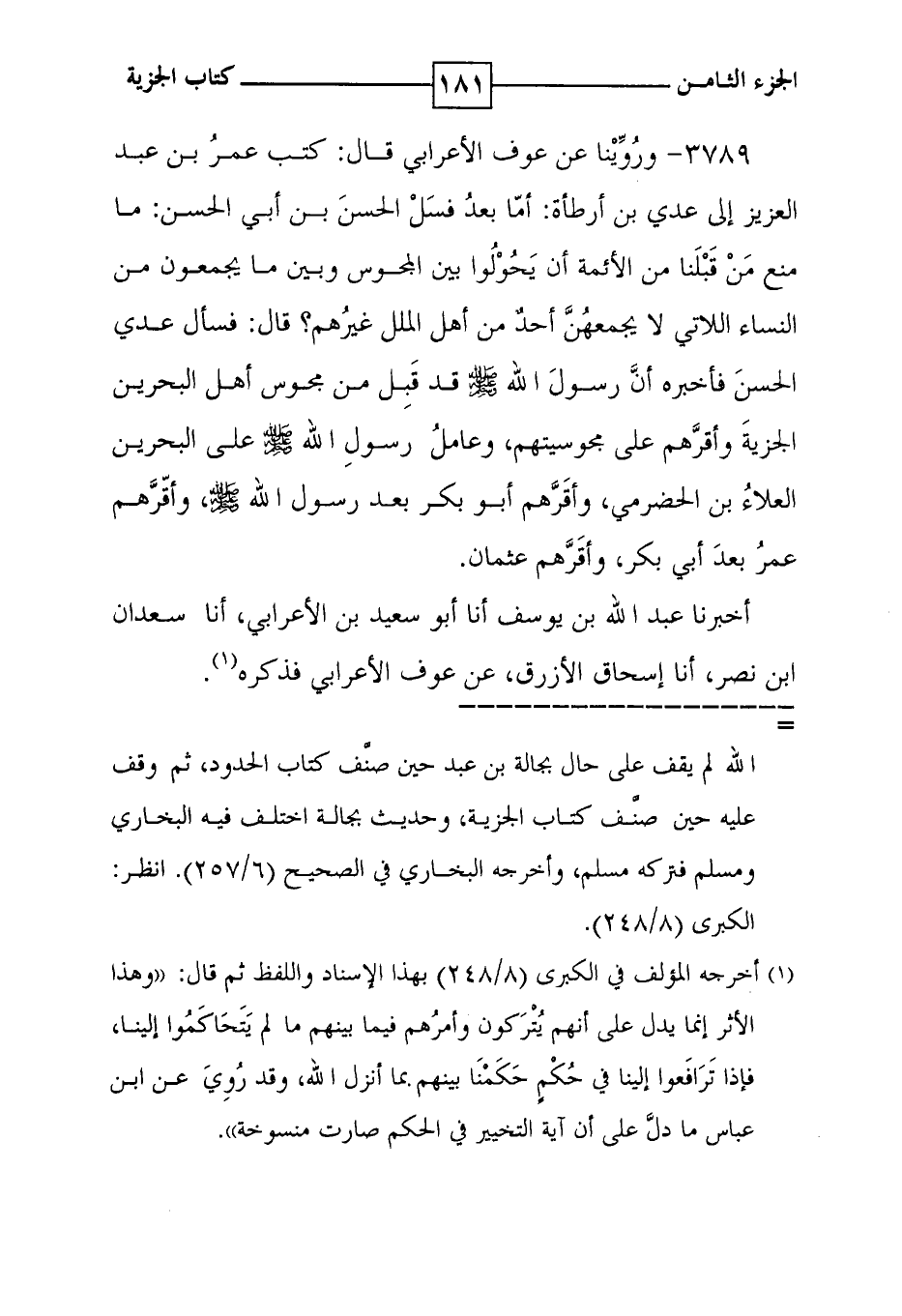 3789 - وروينا عن عوف الأعرابي قال : كتب عمر بن عبد العزيز إلى عدي بن أرطأة : أما بعد فسل الحسن بن أبي الحسن : ما منع من قبلنا من الأئمة أن يحولوا بين المجوس وبين ما يجمعون من النساء اللاتي لا يجمعهن أحد من أهل الملل غيرهم ؟ قال : فسأل عدي الحسن فأخبره أن رسول الله صلى الله عليه وسلم قد قبل من مجوس أهل البحرين الجزية وأقرهم على مجوسيتهم ، وعامل رسول الله صلى الله عليه وسلم على البحرين العلاء بن الحضرمي ، وأقرهم أبو بكر بعد رسول الله صلى الله عليه وسلم ، وأقرهم عمر بعد أبي بكر ، وأقرهم عثمان . أخبرنا عبد الله بن يوسف أنا أبو سعيد بن الأعرابي ، أنا سعدان ابن نصر ، أنا إسحاق الأزرق ، عن عوف الأعرابي فذكره ( 1 ) .