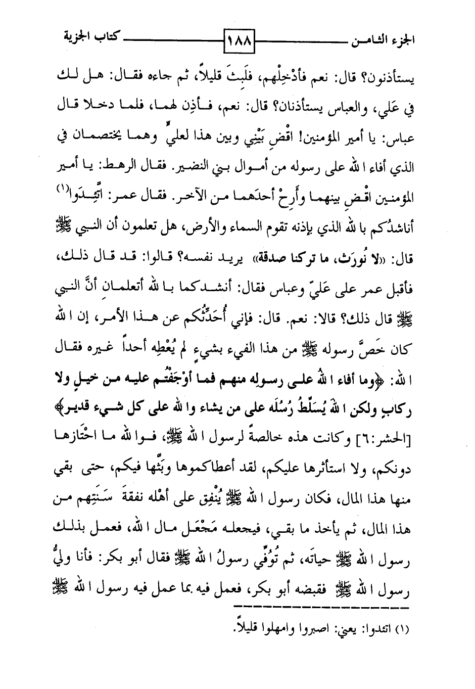 يستأذنون ؟ قال : نعم فأدخلهم ، فلبث قليلاً ، ثم جاءه فقال : هل لك في علي ، والعباس يستأذنان ؟ قال : نعم ، فأذن لهما ، فلما دخلا قال عباس : يا أمير المؤمنين ! اقض بيني وبين هذا لعلي وهما يختصمان في الذي أفاء الله على رسوله من أموال بني النضير . فقال الرهط : يا أمير المؤمنين اقض بينهما وأرح أحدهما من الآخر . فقال عمر : اتئدوا ( 1 ) أناشدكم بالله الذي بإذنه تقوم السماء والأرض ، هل تعلمون أن النبي صلى الله عليه وسلم قال : ' لا نورث ، ما تركنا صدقة ' يريد نفسه ؟ قالوا : قد قال ذلك ، فأقبل عمر على علي وعباس قال : أنشدكما بالله أتعلمان أن النبي صلى الله عليه وسلم قال ذلك ؟ قالا : نعم . قال : فإني أحدثكم عن هذا الأمر ، إن الله كان خص رسوله صلى الله عليه وسلم من هذا الفيء بشيء لم يعطه أحداً غيره فقال الله : ( وما أفاء الله على رسوله منهم فما أوخفتم عليه من خيل ولا ركاب ولكن الله يسلط رسله على من يشاء والله على كل شيء قدير ) [ الحشر : 6 ] وكانت هذه خالصة لرسول الله صلى الله عليه وسلم فو الله ما احتازها دونكم ، ولا أستأثرها عليكم ، لقد أعطاكموها وبثها فيكم ، حتى بقي منها هذا المال ، فكان رسول الله صلى الله عليه وسلم ينفق على أهله نفقة سنتهم من هذا المال ، ثم يأخذ ما بقي ، فيجعله مجعل مال الله ، فعمل بذلك رسول الله صلى الله عليه وسلم حياته ، ثم توفي رسول الله صلى الله عليه وسلم فقال أبو بكر : فأنا ولي رسول الله صلى الله عليه وسلم فقبضه أبو بكر ، فعمل فيه بما عمل فيه رسول الله صلى الله عليه وسلم