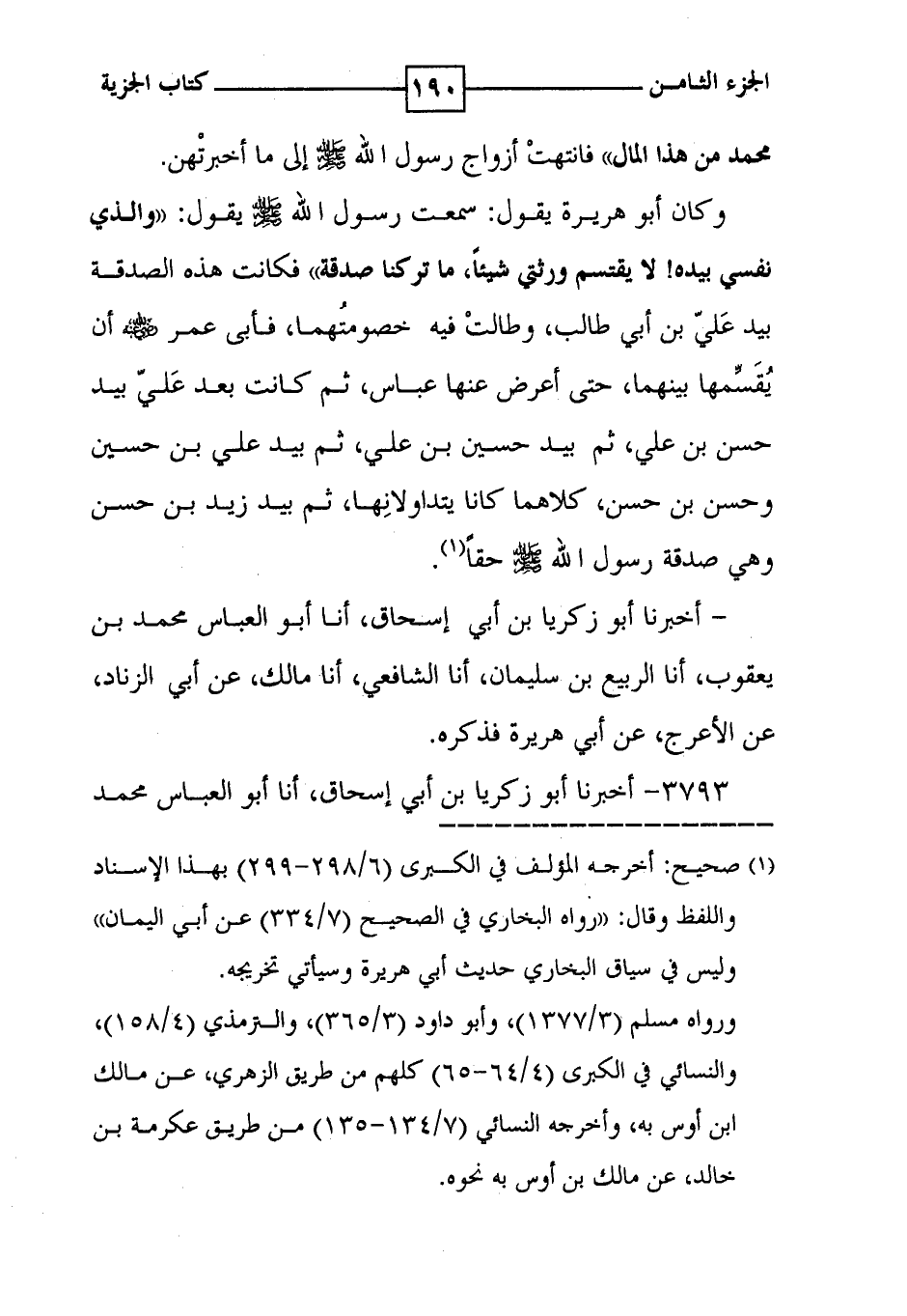 محمد من هذا المال ' فانتهت أزواج رسول الله صلى الله عليه وسلم إلى ما أخبرتهن . وكان أبو هريرة يقول : سمعت رسول الله صلى الله عليه وسلم يقول : ' والذي نفسي بيده ! لا يقتسم ورثتي شيئاً ، ما تركنا صدقة ' فكانت هذه الصدقة بيد علي بن أبي طالب ، وطالت فيه خصومتهما ، فأبى عمر رضي الله عنه أن يقسمها بينهما ، حتى أعرض عنها عباس ، ثم كانت بعد علي بيد حسن بن علي ، ثم بيد حسين بن علي ، ثم بيد علي بن حسين وحسن بن حسن ، كلاهما كانا يتداولانها ، ثم بيد زيد بن حسن وهي صدقة رسول الله صلى الله عليه وسلم حقاً ( 1 ) . - أخبرنا أبو زكريا بن أبي إسحاق ، أنا أبو العباس محمد بن يعقوب ، أنا الربيع بن سليمان ، أنا الشافعي ، أنا مالك ، عن أبي الزناد ، عن الأعرج ، عن أبي هريرة فذكره .