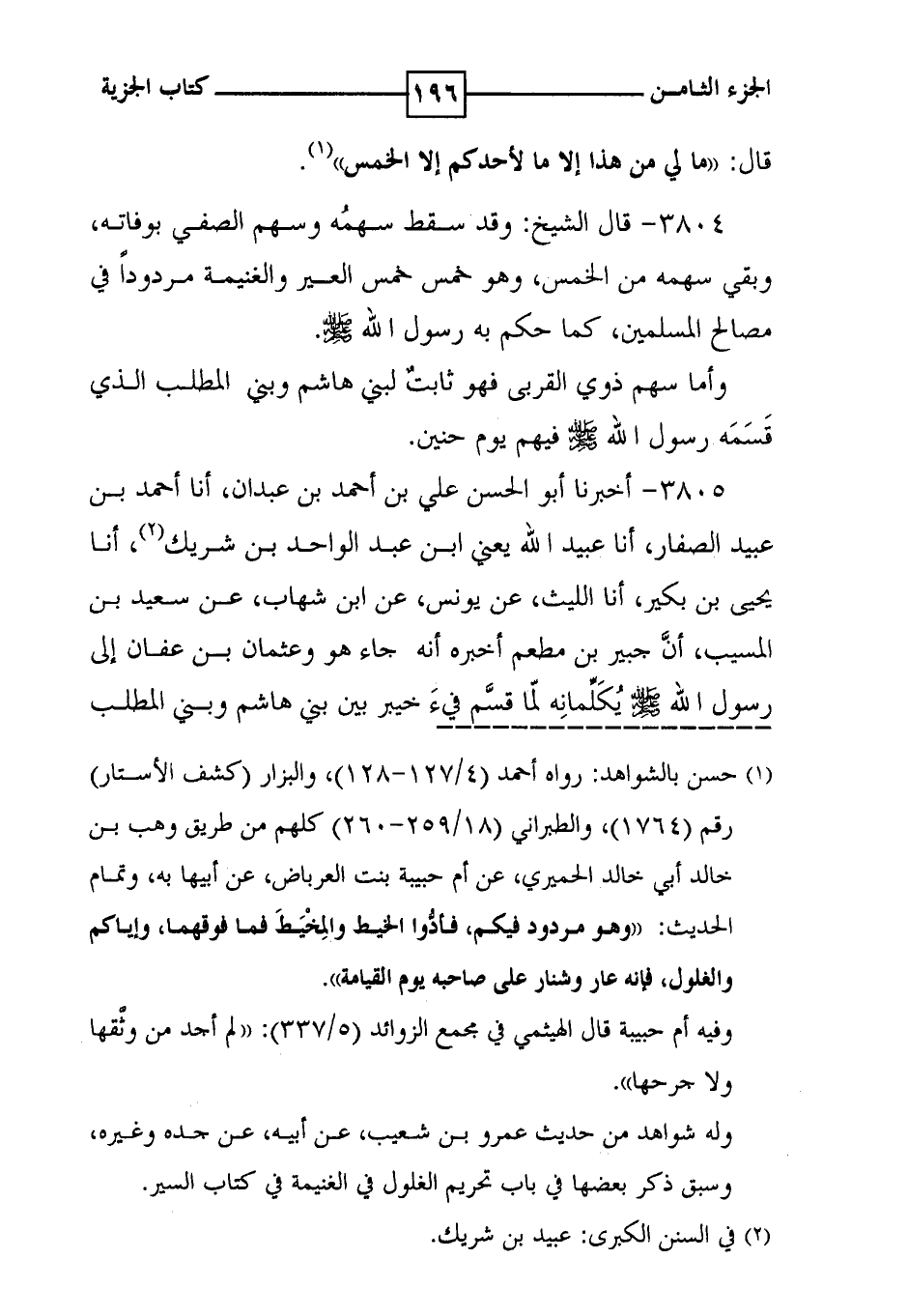 3804 - قال الشيخ : وقد سقط سهمه وسهم الصفي بوفاته ، وبقي سهمه من الخمس ، وهو خمس خمس العير والغنيمة مروداً في مصالح المسلمين ، كما حكم به رسول الله صلى الله عليه وسلم . وأما سهم ذوي القربى فهو ثابت لبني هاشم وبني المطلب الذي قسمه رسول الله صلى الله عليه وسلم فيهم يوم حنين .