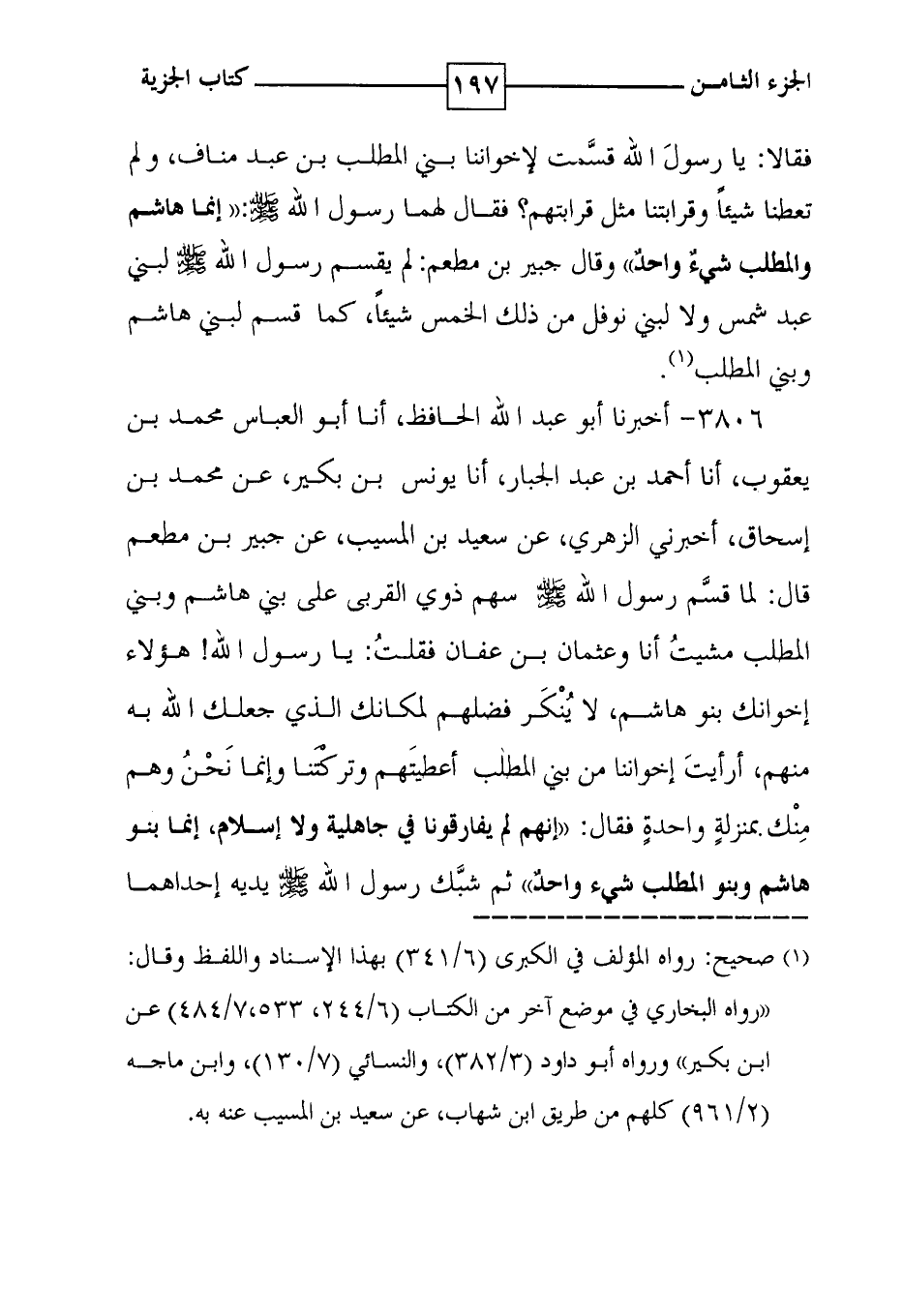 3806 - أخبرنا أبو عبد الله الحافظ ، أنا أبو العباس محمد بن يعقوب ، أنا أحمد بن عبد الجبار ، أنا يونس بن بكير ، عن محمد بن إسحاق ، أخبرني الزهري ، عن سعيد بن المسيب ، عن جبير بن مطعم قال : لما قسم رسول الله صلى الله عليه وسلم سهم ذوي القربى على بني هاشم وبني المطلب مشيت أنا وعثمان بن عفان فقلت : يا رسول الله ! هؤلاء إخوانك بنو هاشم ، لا ينكر فضلهم لمكانك الذي جعلك الله به منهم ، أرأيت إخواننا من بني المطلب أعطيتهم وتركتنا وإنما نحن وهم منك بمنزلة واحدة فقال : ' إنهم لم يفارقونا في جاهلية ولا إسلام ، إنما بنو هاشم وبنو المطلب شيء واحد ' ثم شبك رسول الله صلى الله عليه وسلم يديه إحداهما